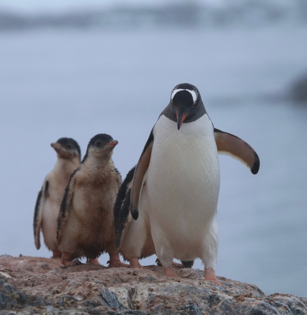 Gentoo penguins are distinguished by their orange bills and feet, they are two to three feet tall when standing. There are a lot of them here and there is a bit of a pong for sensitive noses. It is not long after nesting season and young chicks are out and about, some still lying around to be fed by Mum and Dad penguin.