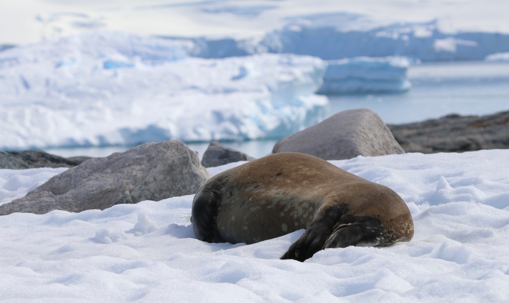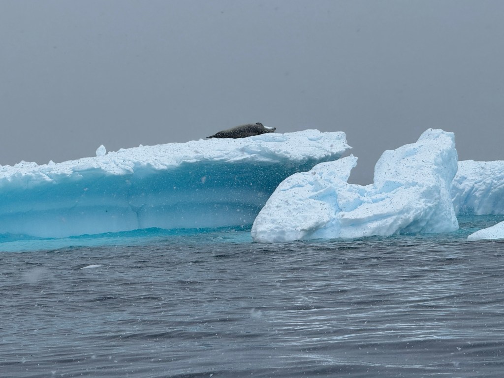 Sighted some Weddell seals and a lone Gentoo penguin aboard icebergs in the bay.