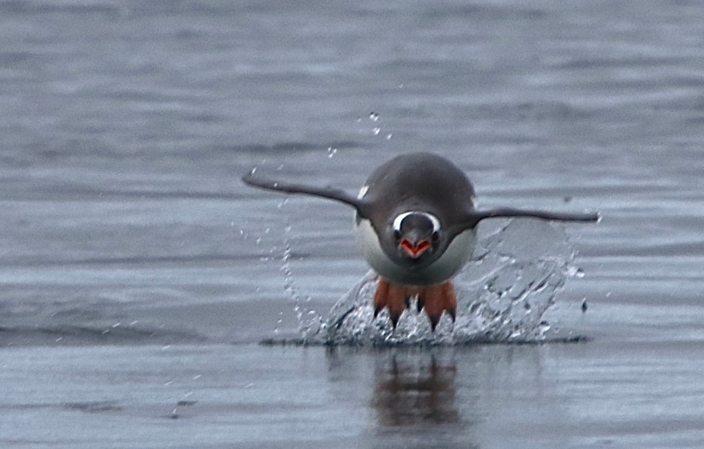 We had some whale encounters and were entertained by a ‘raft’ of penguins beside the SOB. Leanne secured another great video of the show and we got a still shot of one of them in ‘flight’.