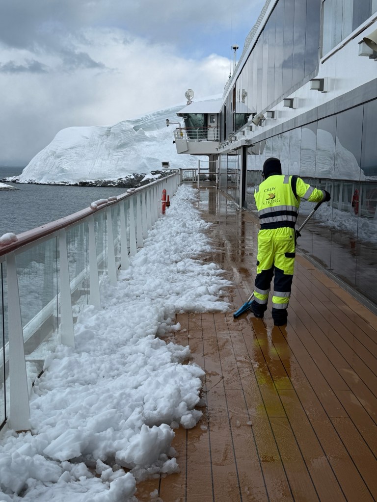 We had another day of pleasant sunny weather after a cloudy start. There had been a big dump of snow overnight and the decks were quite clogged but cleared away with some crew action and the sun.