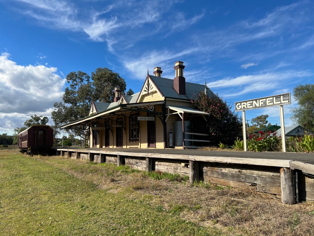Gold was big in Grenfell too in the 1860s and remnants of the mines are on display on O’Briens Hill. A couple of open shafts and old equipment lie around the workings. There were more than ten thousnad people working on the diggings when Henry Lawson was born. Something like thirty hotels lined the town’s streets, ten banks as well, some of the grander buildings remain today. Trains no longer come to Grenfell to carry away wool and grain, but the restored heritage station and its precincts stand, nearby the free camp site for van travellers.