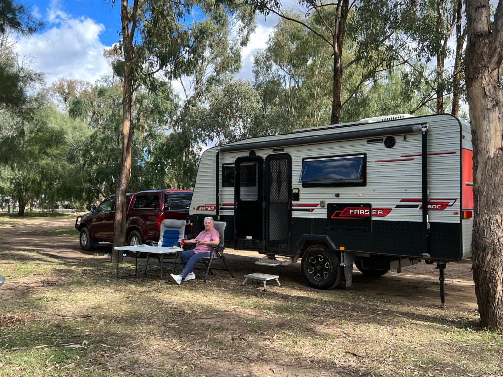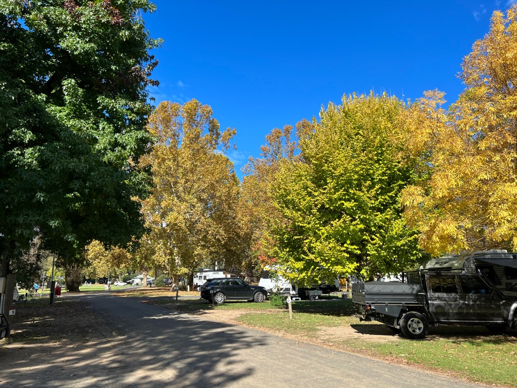We have made it to Tumut. This is a neat little town and we are camped on the banks of the Tumut River a few hundred metres from the centre of town. Sort of too far to walk but not far enough to drive. So it depends what mood you are in and what you have to carry back of course! Allthego set off early one morning along the river walk, very pleasant stroll into town. The objective was to pick up a loaf of bread for breakfast from the local bakery, but what does one find at a bakery, all sorts of goodies. So back he came with some bacon and cheese topped buns and a custard tart, as well as the bread of course. Carting this stuff back resulted in the bread being a little crushed in order to save the rolls and the buns. The buns though were excellent along with some bacon and eggs for breakfast beside the shallow swift flowing river. This part of the world is now showing the full colours of the autumn transformation. The poplars, elms and liquid ambers are golden in colour with splahes of orange and red here and there. Fallen leaves cover the campsite.
