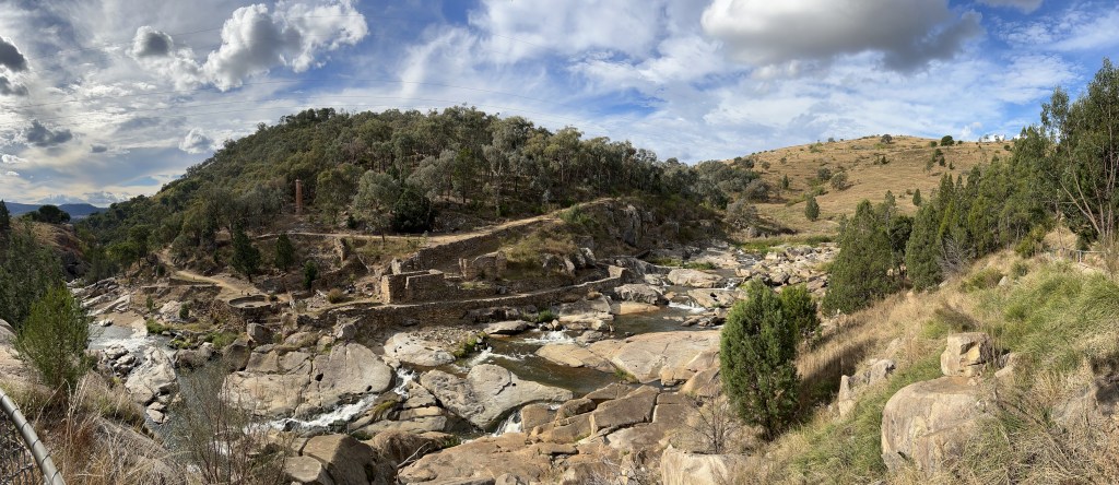 We have had good weather to date. Sunny, dry and blue skies but the forcasters are pointing towards some rain. So we set off to look around the district with an afternoon trip to Blowering Dam and along the Snowy Mountains Highway for awhile towards Talbingo. Next day it was off to nearby Batlow to check out the apples and cider. We came back to Tumut via a loop road through Adelong, a small town famous for its gold mining heritage in the Adelong Gorge. Here, along the gorge banks are the remnant stone works of a major 19 th century gold mining enterprise. Quite an interesting site to view from the top looking down. It must have been a hive of activity a hundred and sixty years ago.