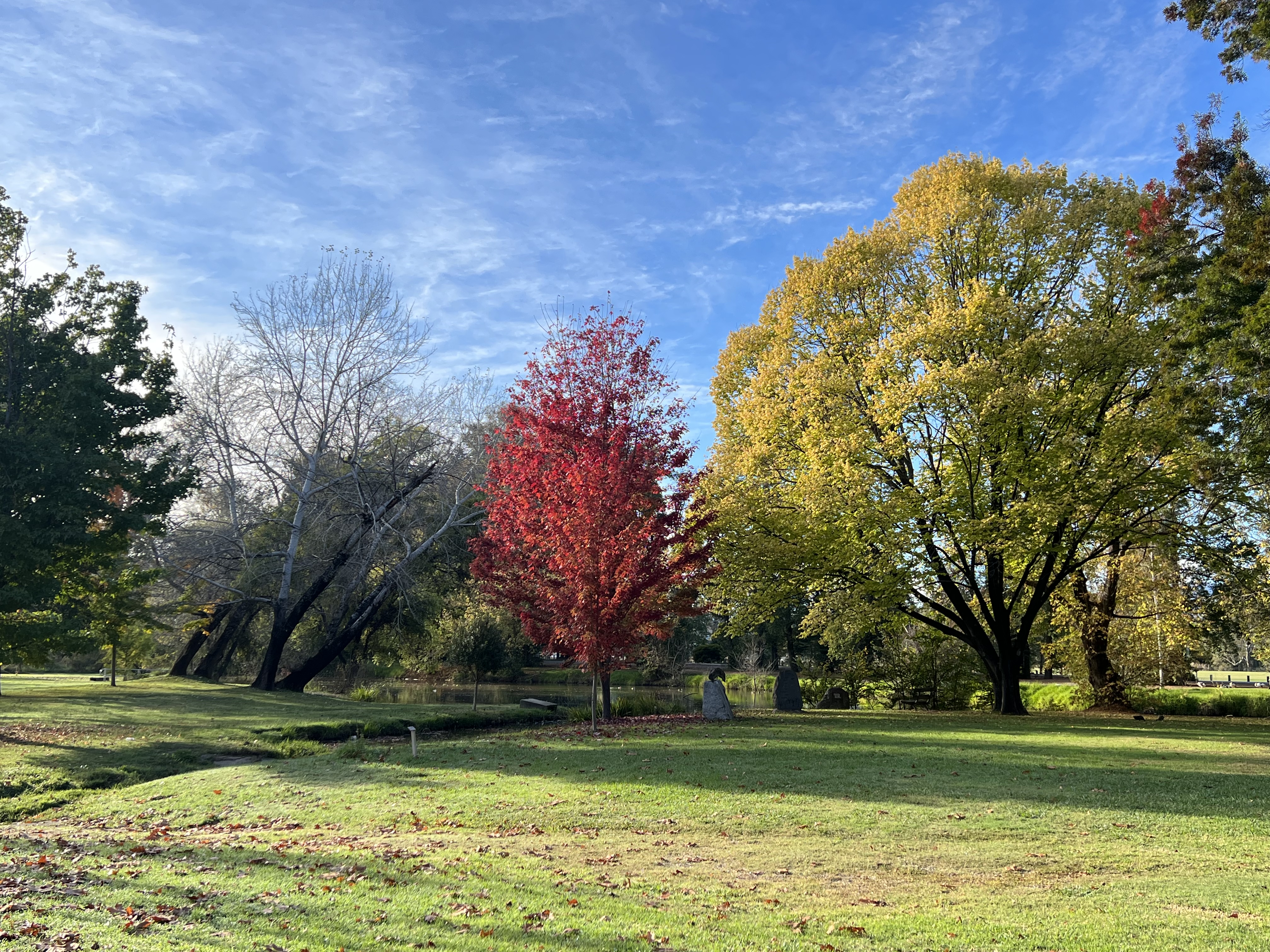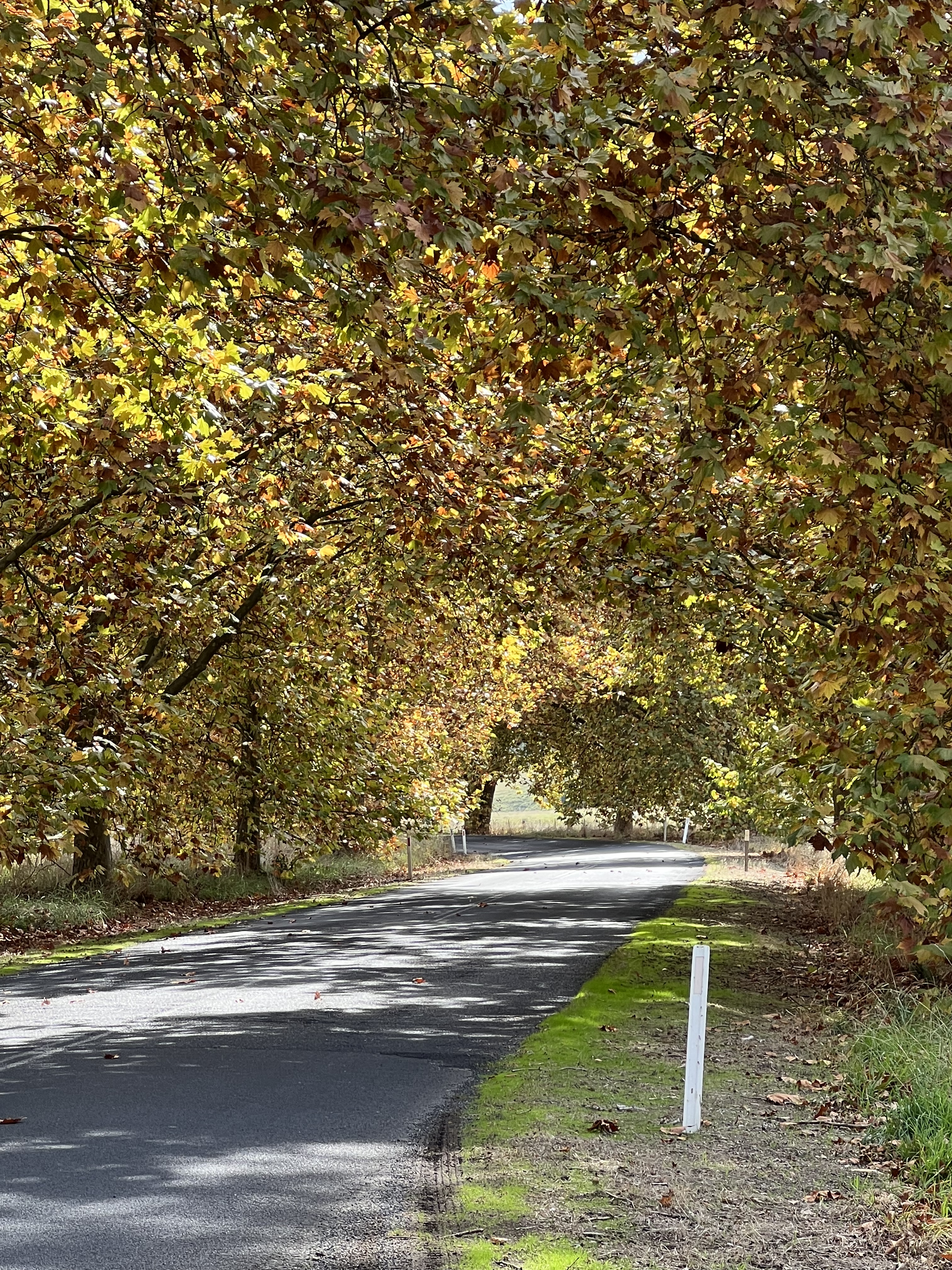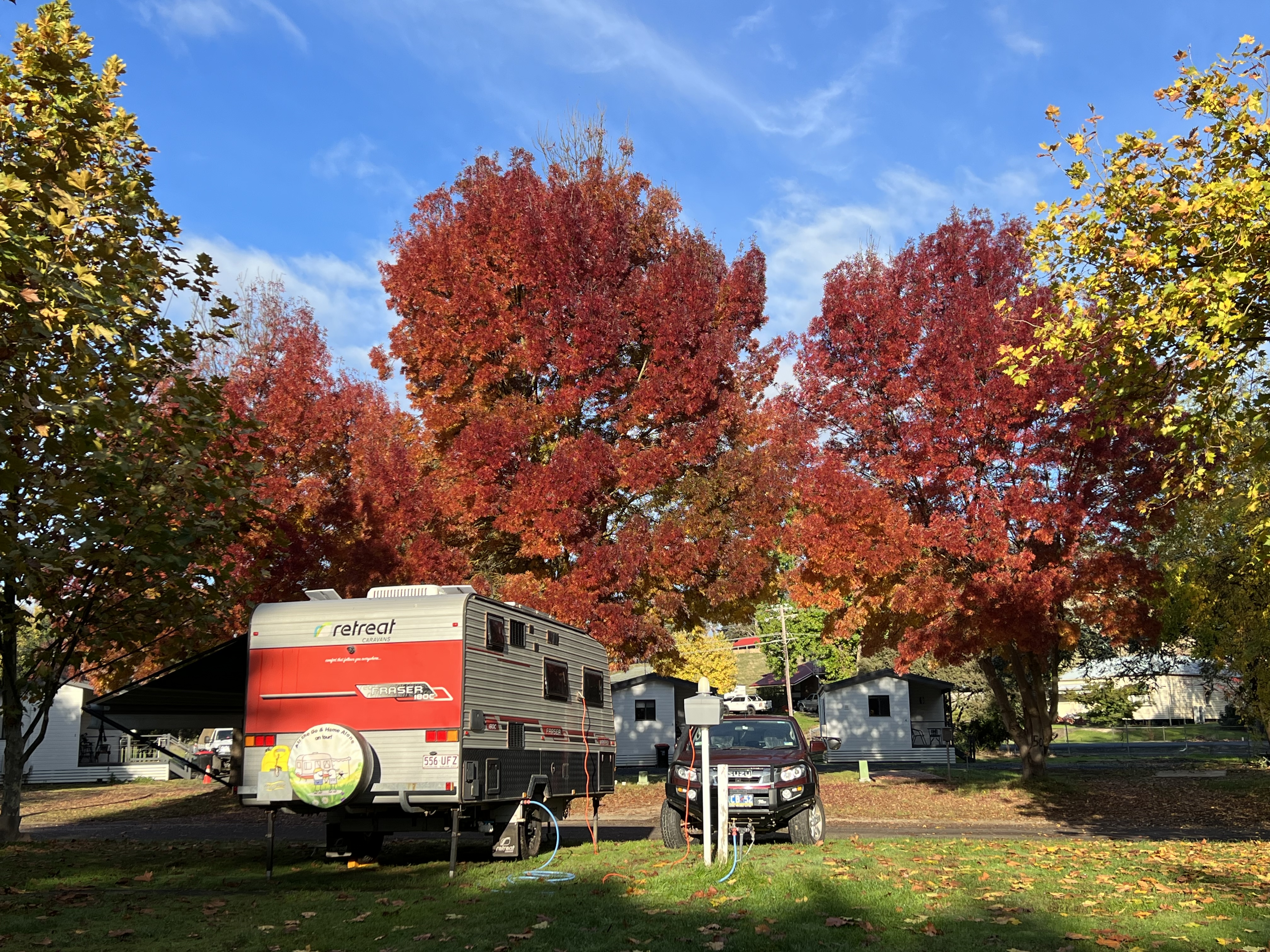 We have made it to Tumut. This is a neat little town and we are camped on the banks of the Tumut River a few hundred metres from the centre of town. Sort of too far to walk but not far enough to drive. So it depends what mood you are in and what you have to carry back of course! Allthego set off early one morning along the river walk, very pleasant stroll into town. The objective was to pick up a loaf of bread for breakfast from the local bakery, but what does one find at a bakery, all sorts of goodies. So back he came with some bacon and cheese topped buns and a custard tart, as well as the bread of course. Carting this stuff back resulted in the bread being a little crushed in order to save the rolls and the buns. The buns though were excellent along with some bacon and eggs for breakfast beside the shallow swift flowing river. This part of the world is now showing the full colours of the autumn transformation. The poplars, elms and liquid ambers are golden in colour with splahes of orange and red here and there. Fallen leaves cover the campsite.