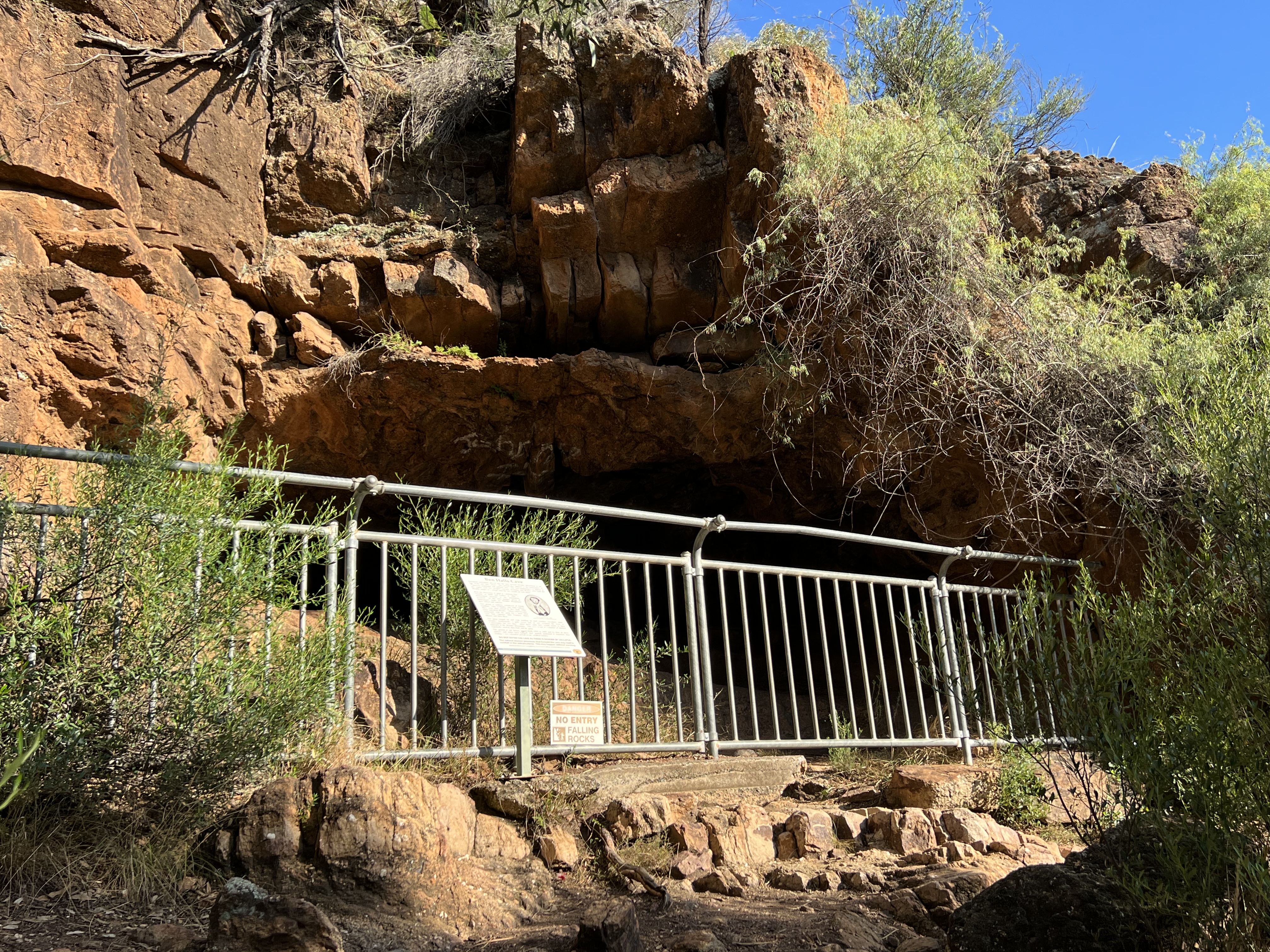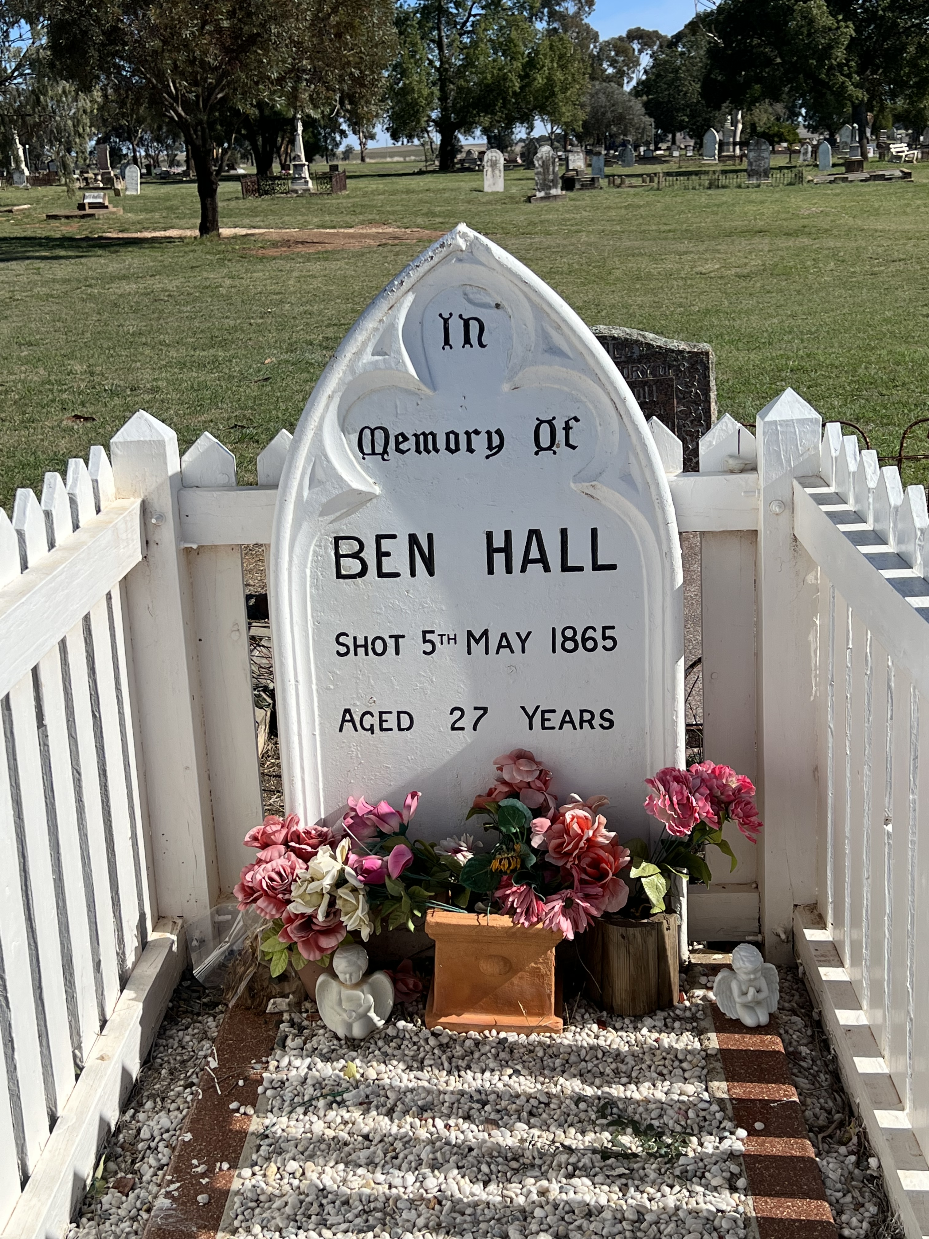 Ben Hall, the bushranger was shot in 1865 in Forbes at the age of 28. Over hundred robberies were attributed to Hall and his associates. We saw his grave in the Forbe’s cemetary. He was a Grenfell identity though and frequented the region, using the area as a base for his activities. A cave in the Weddin Mountains is thought to be one of his hide-outs, we did the short walk up the escarpment to its location. Interesting spot, a good look out for approaching police!