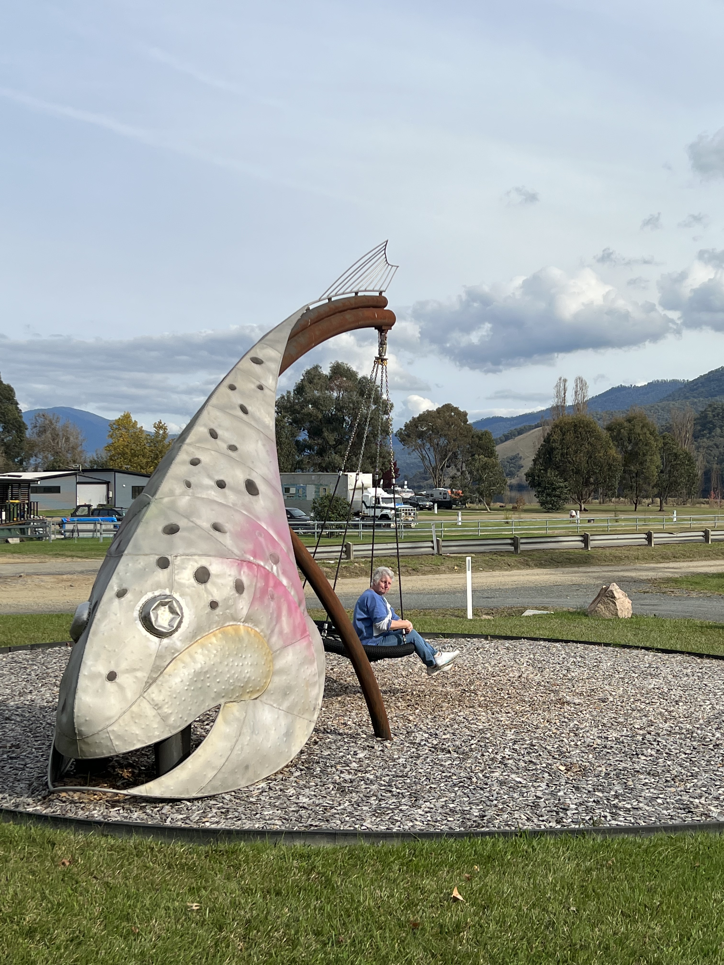 Our campground is beside the lake and we are greeted there by a rainbow trout sculpture. Further up the Alpine Way is Tom Groggin Campground beside the upper reaches and not far from the source of the Murray River, known as the Indi River in this section of its course. Tom Groggin is our next destination, weather permiting for two nights, for the start of our run down the Murray.