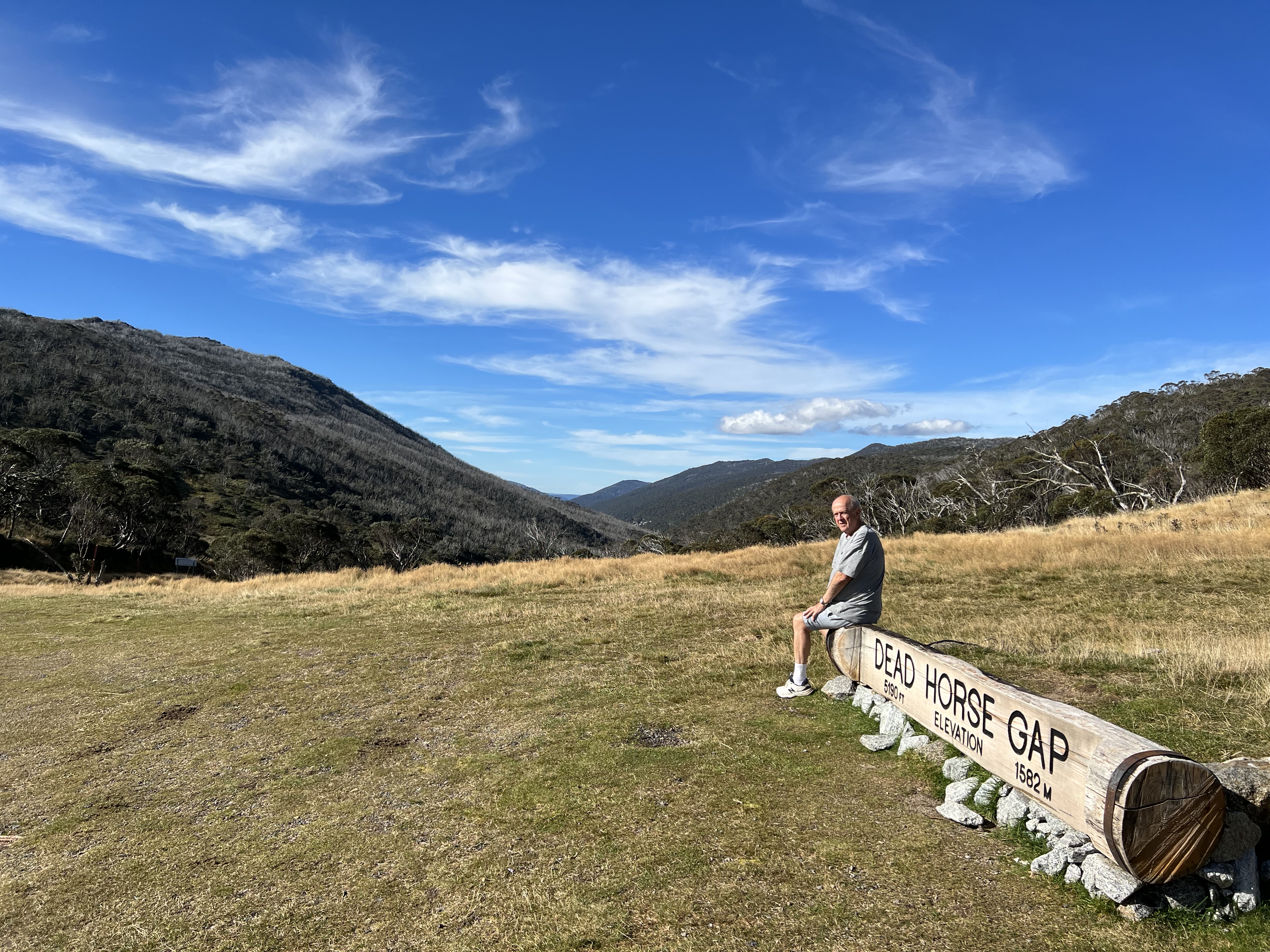 We have used Tom Groggin as a base to head further along the Alpine way to Thredbo, ultimately going down to Jindabyne to get fuel, Sundays are not a good day for fuel at Thredbo. Along the way we passed the ‘Pilot’ lookout, we felt no desire to pursue the source of the Murray further in its direction. Coming into Thredbo the road passes through Dead Horse Gap, requisite photo taken on the log looking down into the valley below. We retraced our steps to Tom Groggin, these sort of testing drives always seem easier on the return, one knows the bends I suppose!