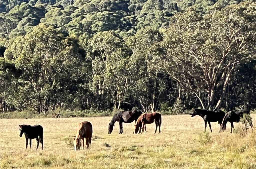 We have taken the opportunity at Tom Groggin to have some fires, in part to keep warm but also to experience that great outdoors feeling of heat and a bit of smoke. Had some steak one night over the fire and the other a freshly made meat lovers pizza in the Weber and then enjoyed by the fire. It was a pretty cool night; doona, blanket and rug keep the chills at bay! Some brumbys charged through the campimg ground during the early night hours, they lingered it seems and left tell tale signs of their passage.