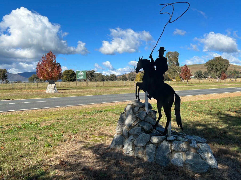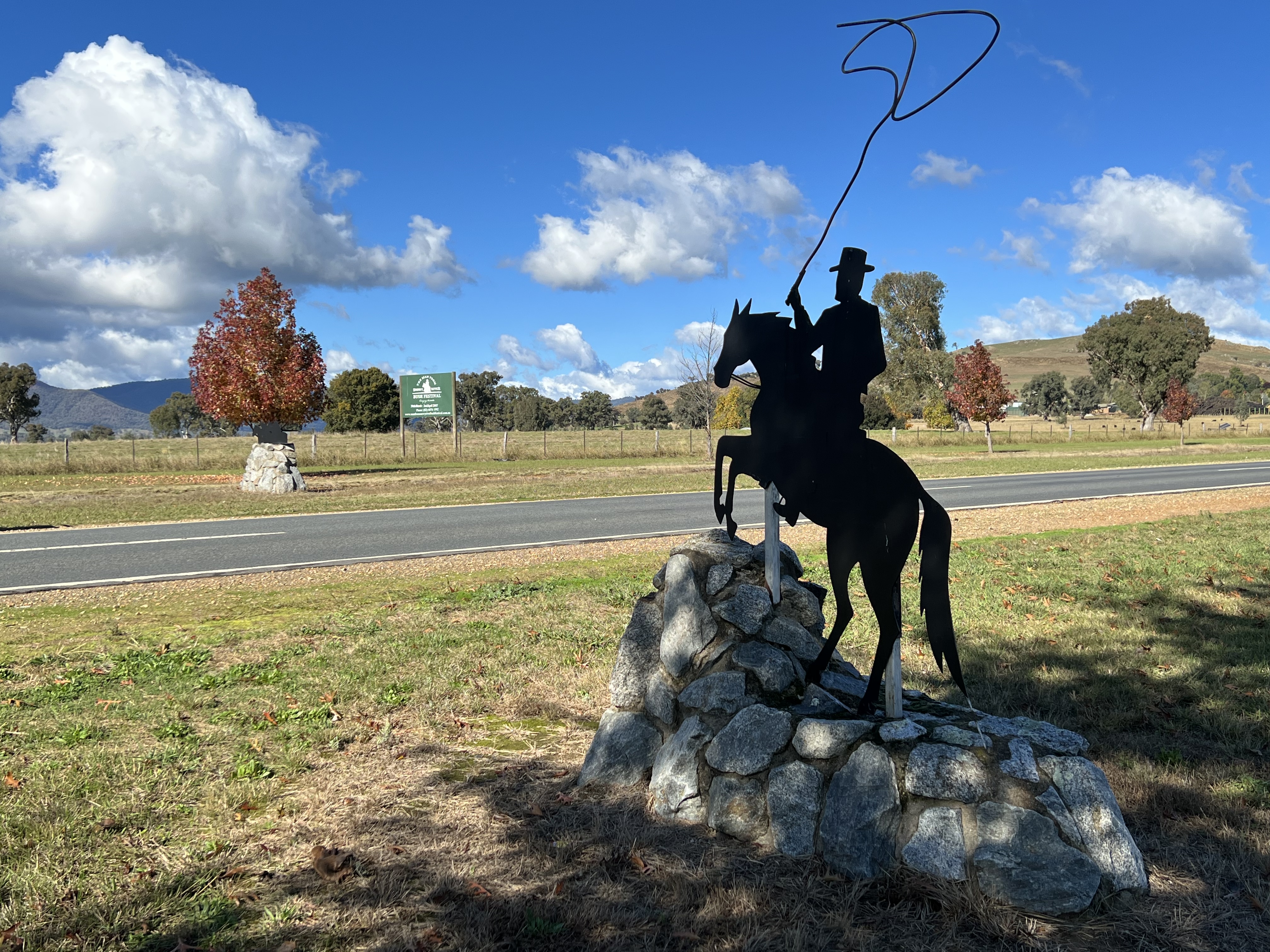 Further along we take a side trip off the road and drop into Corryong, The Man from Snowy River (MFSR for short) Bush Festival takes place here each year. Corryong is the MFSR capital of north east Victoria. it has a stranglehold on the poem written by Banjo Patterson, ‘The Man from Snowy River’ not to be confused with ‘Clancy of the Overflow’. Allthego struggles with this not being a student of the poem(s), or perhaps ‘tales’ is a better description. There are a few sculptures, murals and other oblisques around the town commemorating the story and its central character.