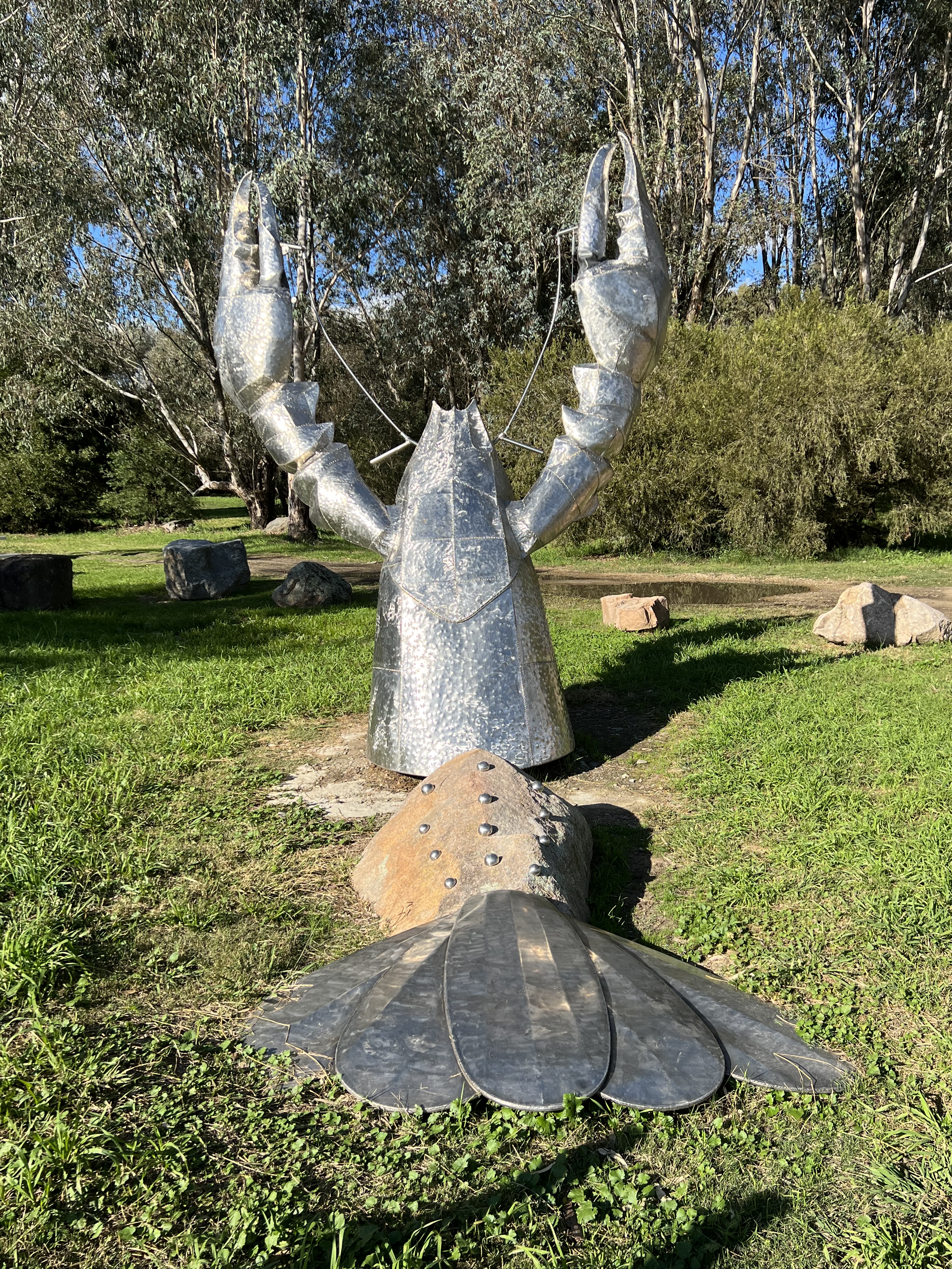We cross the Murray and enter Victoria for the first time on our journey at the Bringenbrong Bridge. It is a great little spot showcasing the Murray as it continues the rush downstream. Along The Great River Road a number of sculptures have been placed highlighting aspects of river life. Here it is the Murray River Crayfish, a sort of big yabbie. It is I believe the second largest fresh water crayfish in the world, it can be caught (subject to seasonal and bag limits) and features on regional menues along the river.
