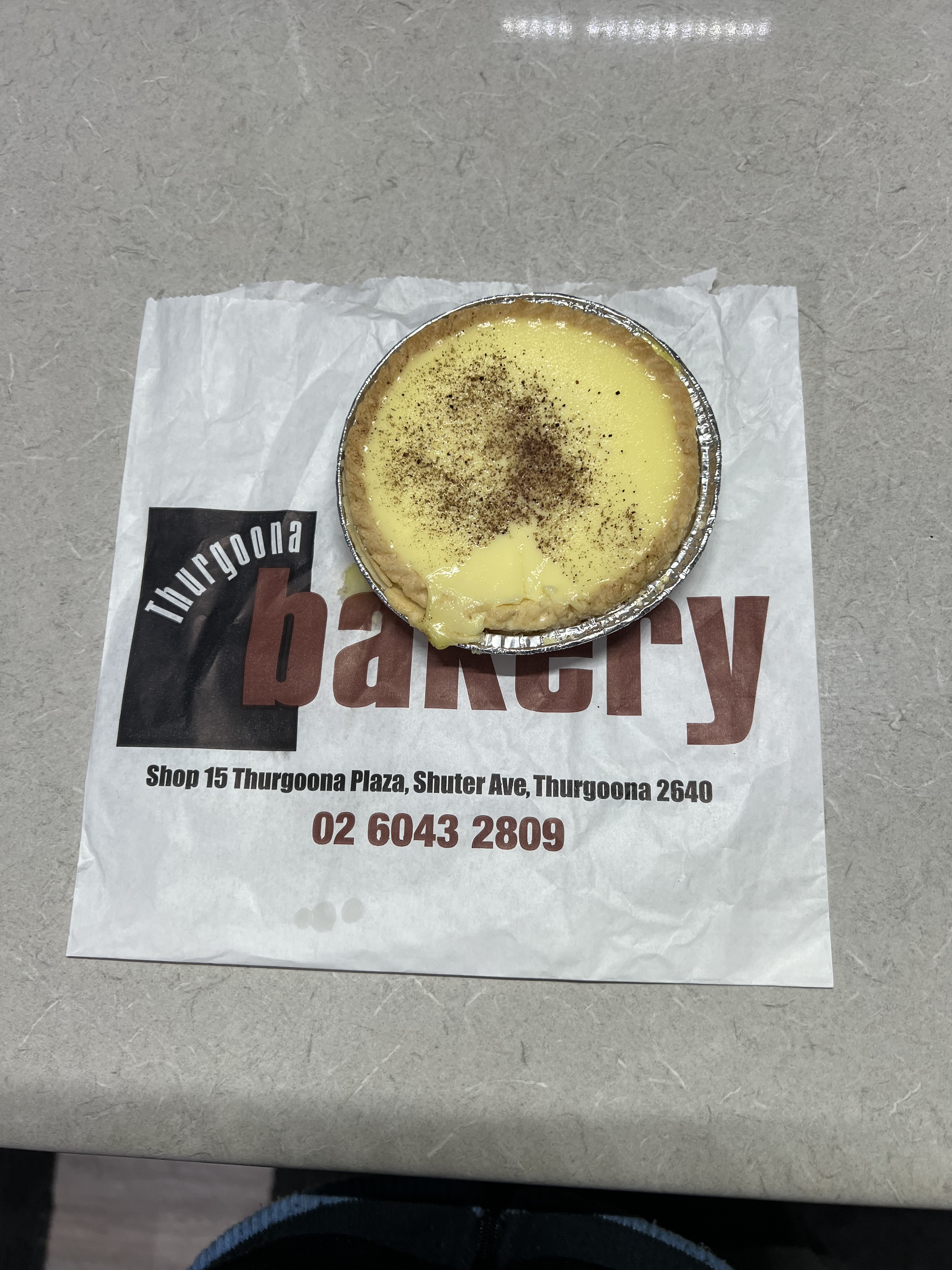 Whilst in Tallangatta we paused for a short break and managed to find a custard tart. this was an interesting specimen because it appeared to have been cooked differently to the ones we have had to date. The egg custard appears to have been put into an uncooked casing and then all baked at once! Result, soggy pastry! Allthego and Homealone think the pastry has to be cooked first and then the cusrtard added, to keep it all nice and crunchy. A short distance from the Hume Weir we had found another bakery, next door to a Woolies, its custrad tart was unimpressssive, lacked flavour, although a reasonable yellow eggy colour. We are no closer to the great custard tart! But they are starting to look the same. Why no variety? Why not some stewed apple under the custard?