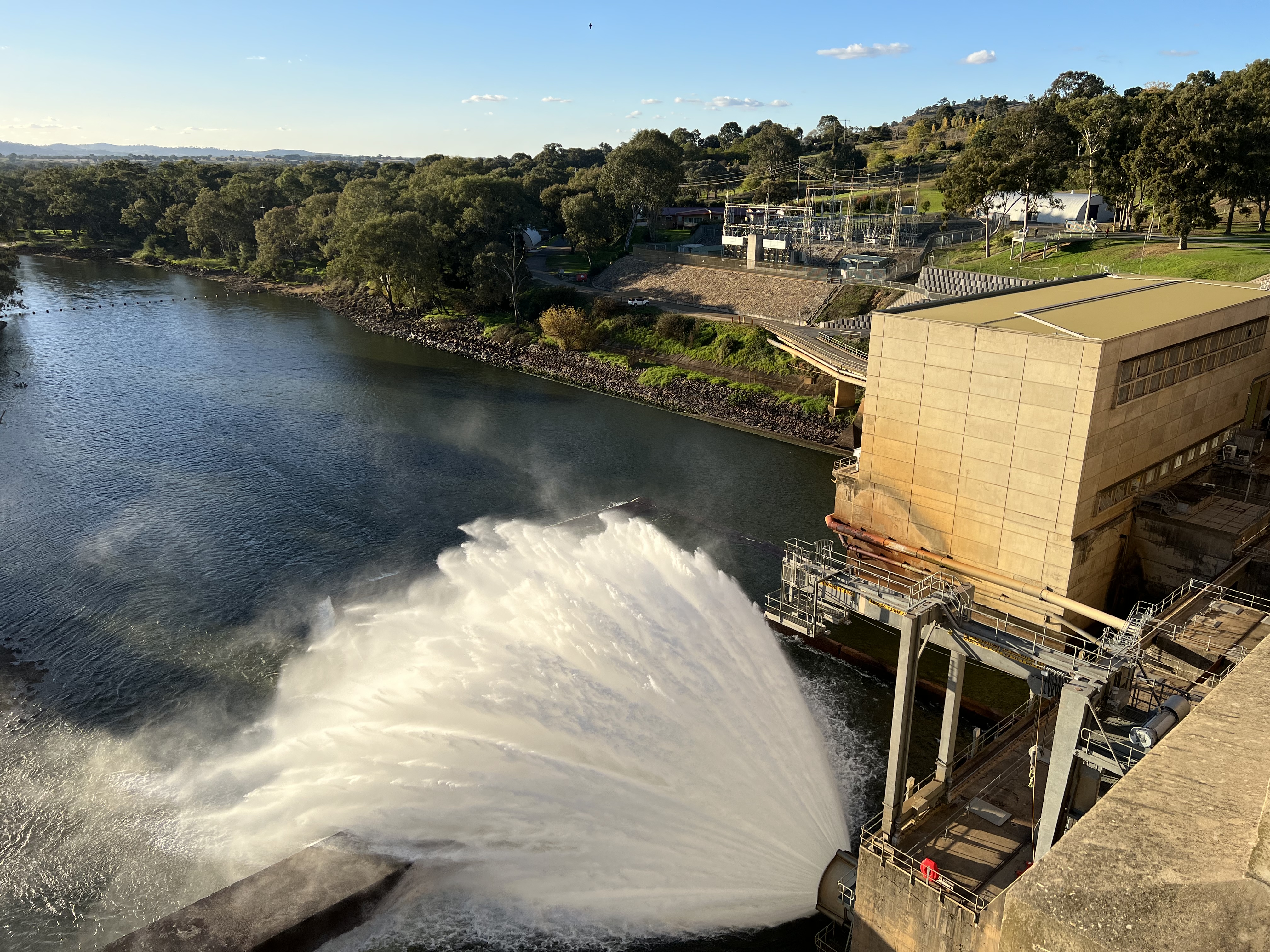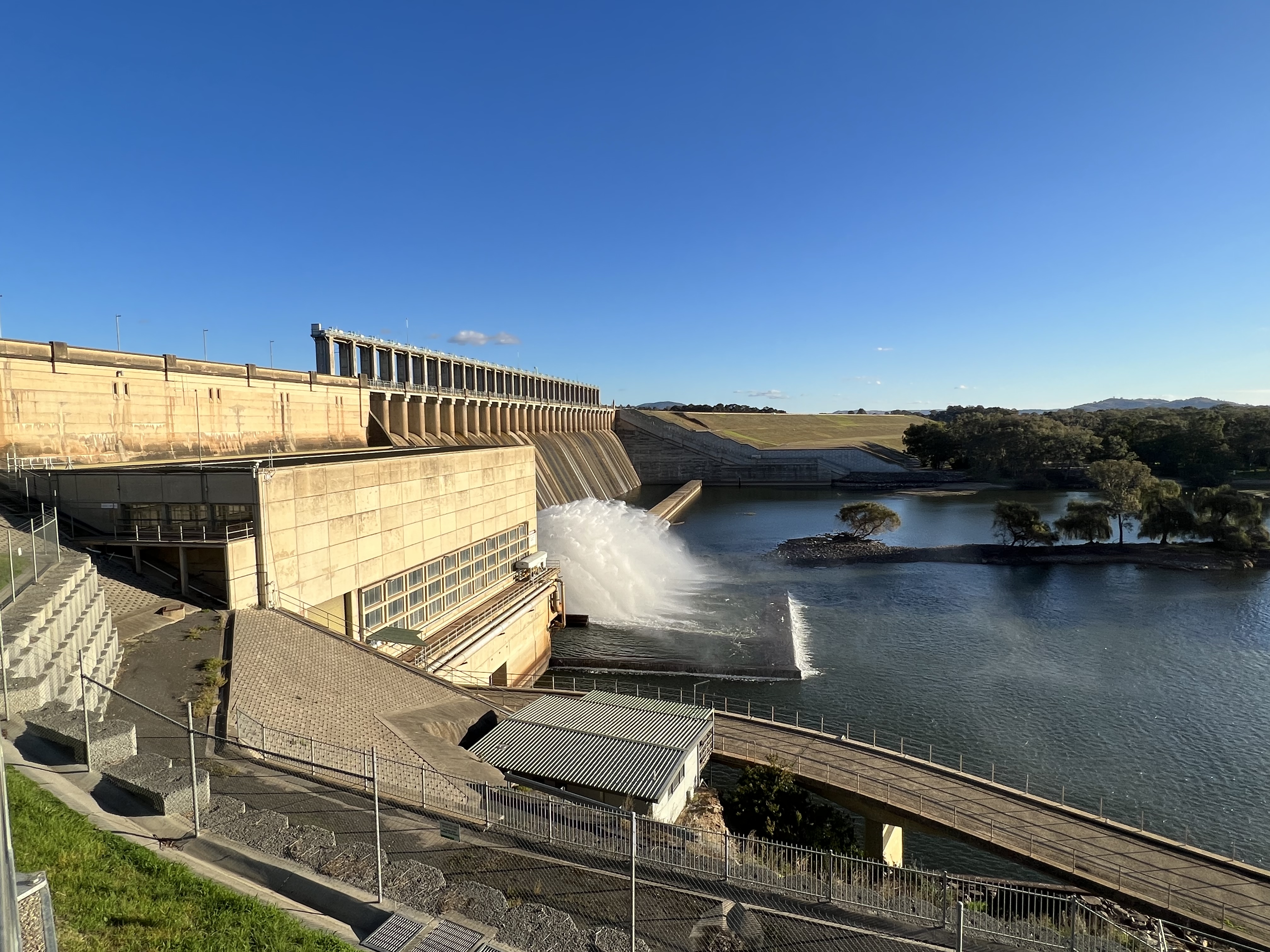 We are staying at the Van Park beside the Hume Weir about 10 km from town. The internet isn’t great, down by the water, around a corner looking out over the dam. Few other people here. This is one of those caravan parks that is being consumed by huts, eating up caravan spots and taking good locations. Building work in full swing. If not careful it will become a little gulag by the dam. For a hut they get three times what a caravan spot is and I suppose this is the attraction for the operator. Annoys the grey nomads though! The dam spill way is spectacular at the moment, oddles of water being let go.