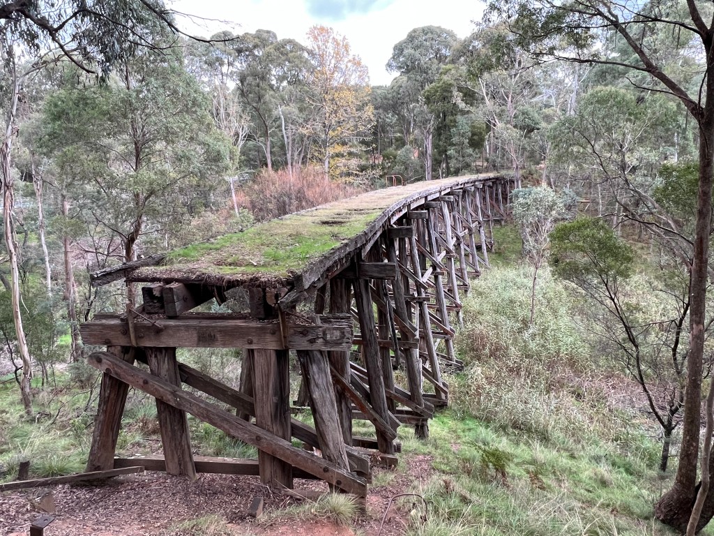 We have also set out along the other side of the river back towards Corryong, along the Murray Valley Hwy to Tallangatta, a new town that grew up in the 1950s when ‘Old’ Tallangatta was moved to higher ground to accomodate the expansion of the Hume Weir. Further on we reached Koetong a stop along an old rail line from Albury. There are still a number of remnants of the line, which is now a rail trail, along the way. Allthego wandered down the trail for a short distance to catch an early 1900s trestle bridge across a gully two stories high. Steam trains used to ply this route and in the 1950s it was used to transport materials for the Snowy Scheme into the highlands.