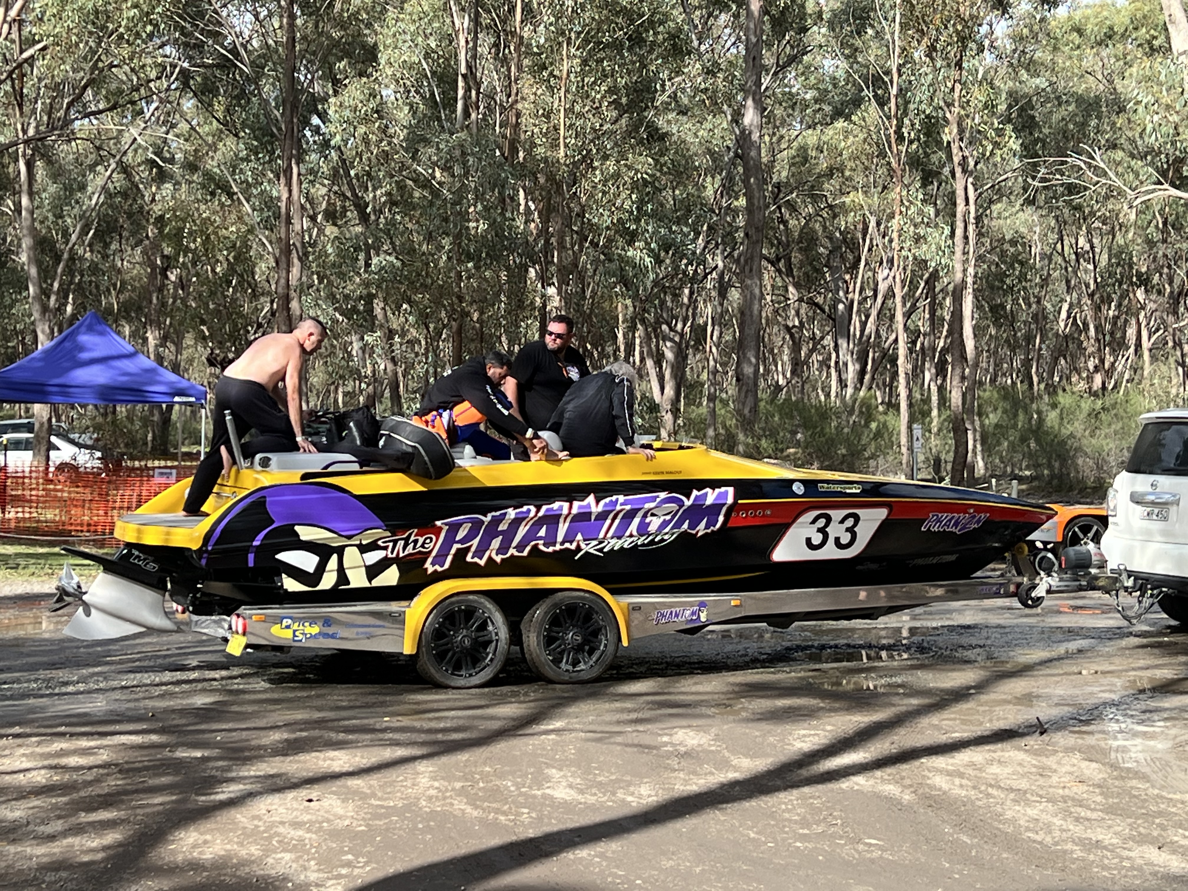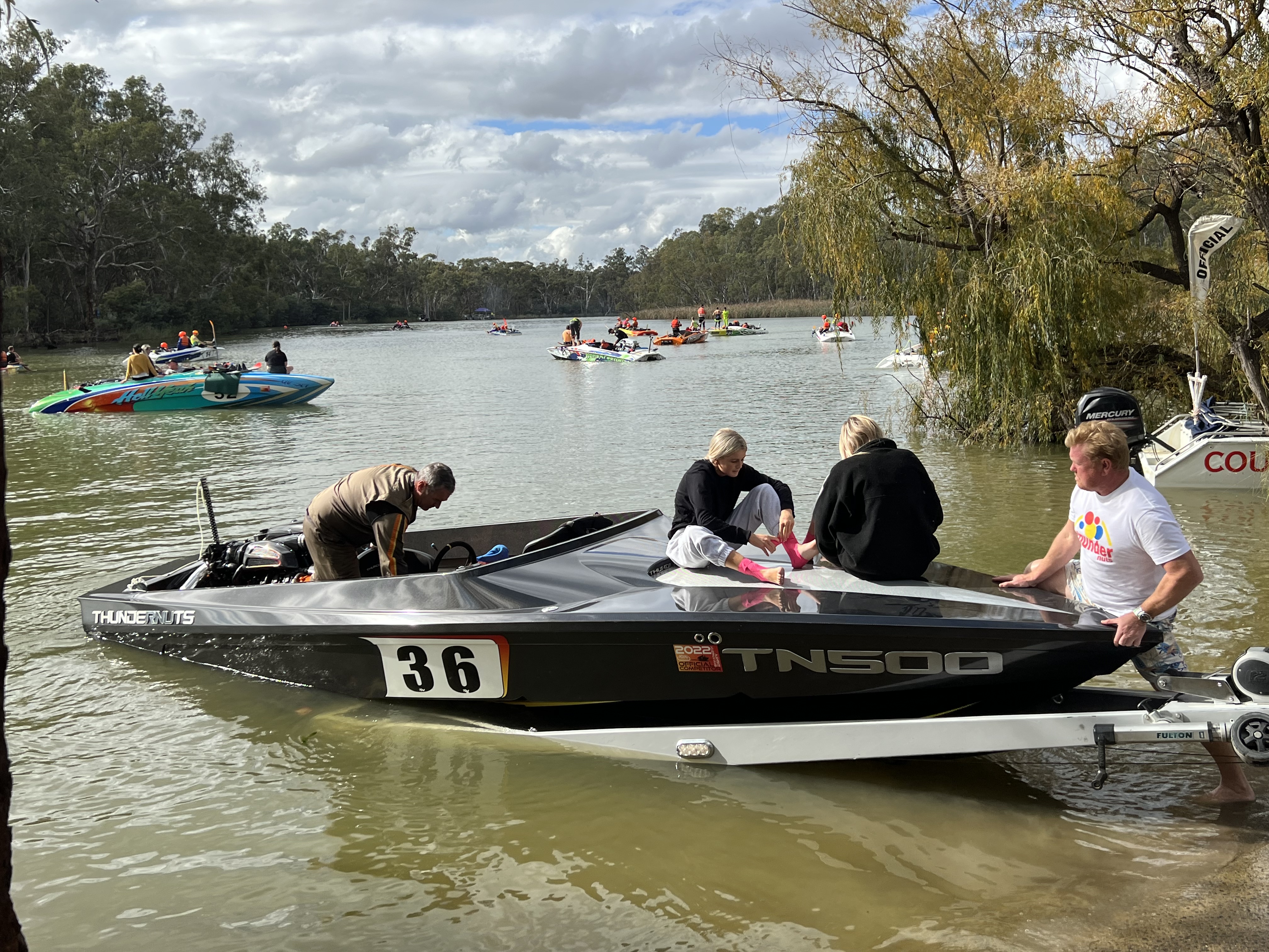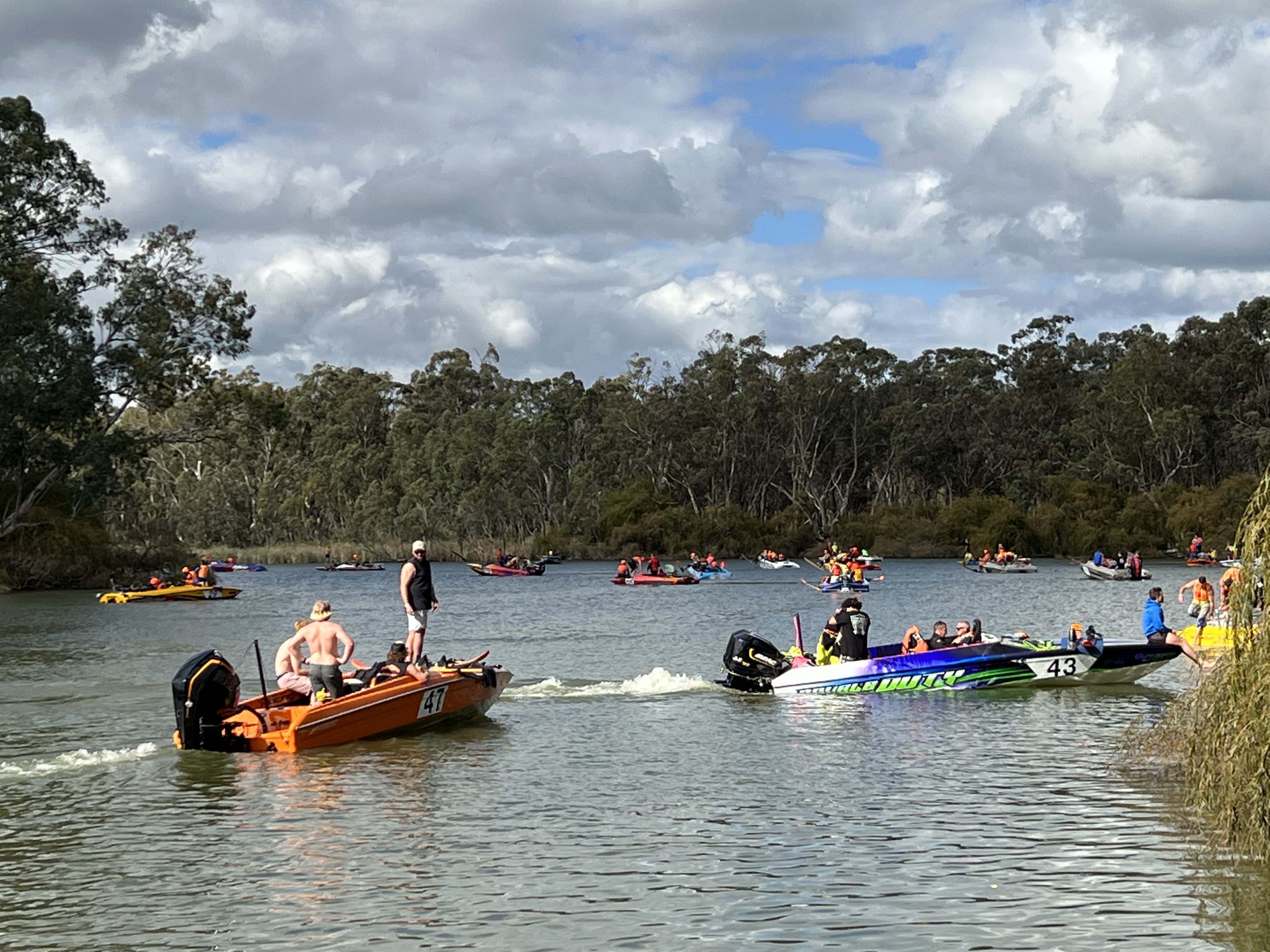 When we arrive at the weir there is a large jam of cars and speed boats on the road into the river. The delayed, due to Covid, Southern 80 water ski race is on today. How could we not avoid it? There are numerous classes of entries. Some powerful jet boats indeed. The race leaves the weir and heads 80 km upstream back to Echuca. The fastest boats and skiers do it in 40 miniutes, or thereabouts. There are two skiers behind each boat, on one ski each. The water was a mass of colour and throbbing motors as boats messed around before moving to the start point. We had morning tea and lunch here watching the action.