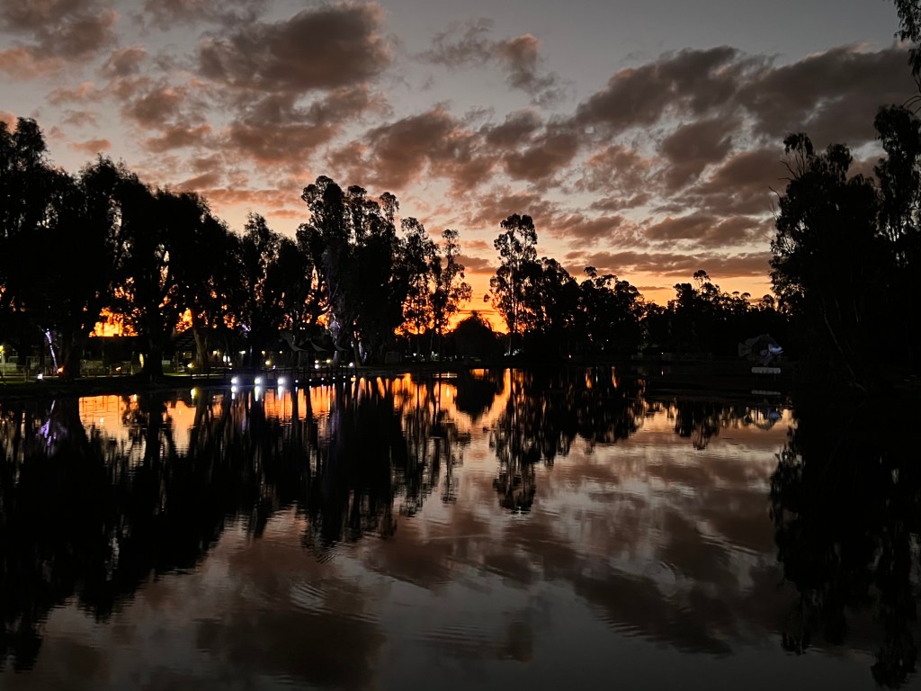Further along we decide to stop the night at a free camp beside Gunbower Creek at Cohuna, it is a great free camp opposite the town. It is Sunday and Allthego was hoping to catch the Eels playing at the local hotel over dinner. But alas the pub is closed for food and there is only AFL on the big screen. We stopped in for a drink and are entertained by a couple of old timers bemoaning how times have changed in the town, they had a limited vocabulary and descibed most things as ” ….. this and …. that”. We moved on and picked up some fish ‘n chips at the local cafe for dinner. First fish ‘n chips for nearly a month! Great sunset at the freecamp. We will make it to Swan Hill in the morning!