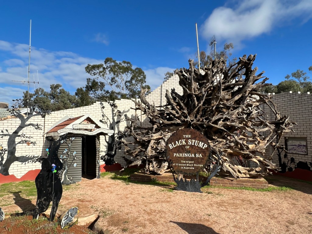 Earier we called into Lock 5 at Paringa. The locks are all looking the same but the nearby Black Stump didn’t. Apparantly, our biggest of eleven black stumps around the country. It was big. In front of a house that had some metal cut out Murray Cod replicas for sale. Allthego couldn’t resist one of these craftwork icons and picked a good one up for a bargain price. The marble eye is a bit wobbly but can be fixed later. Will look good down by the pool at Bedwell Place.