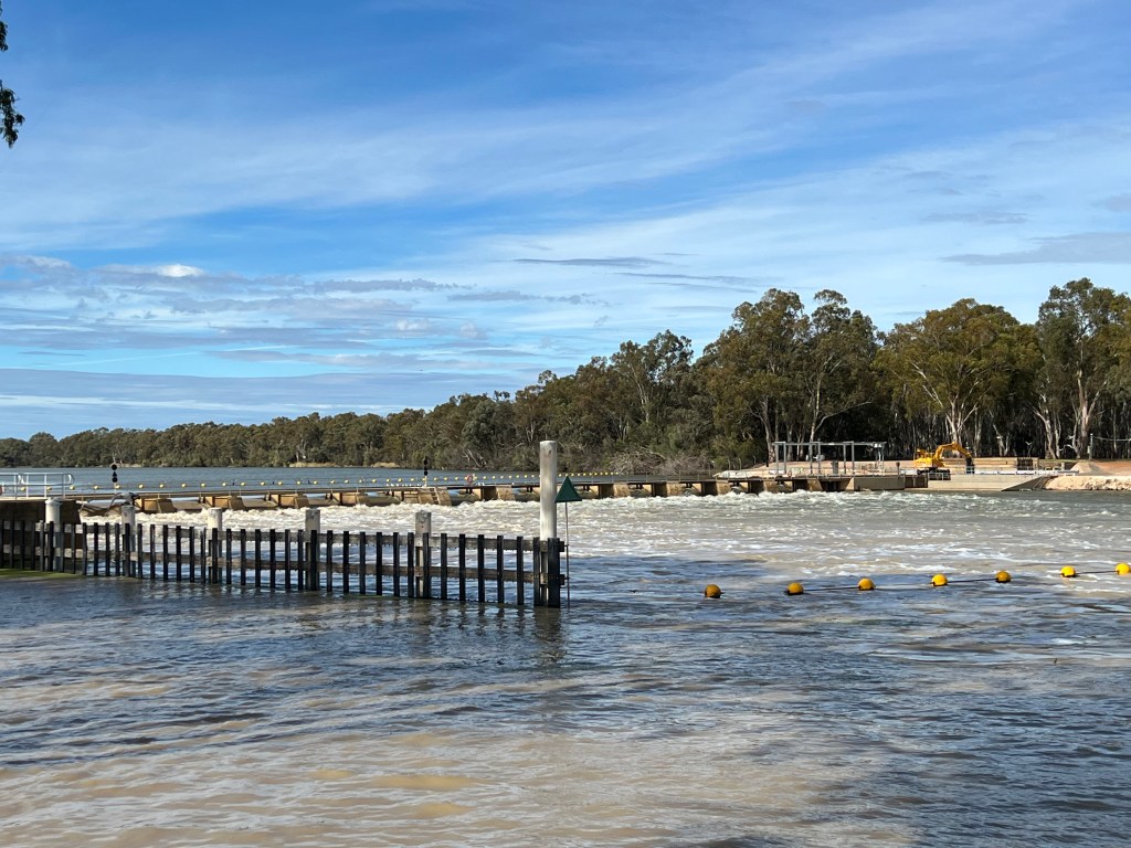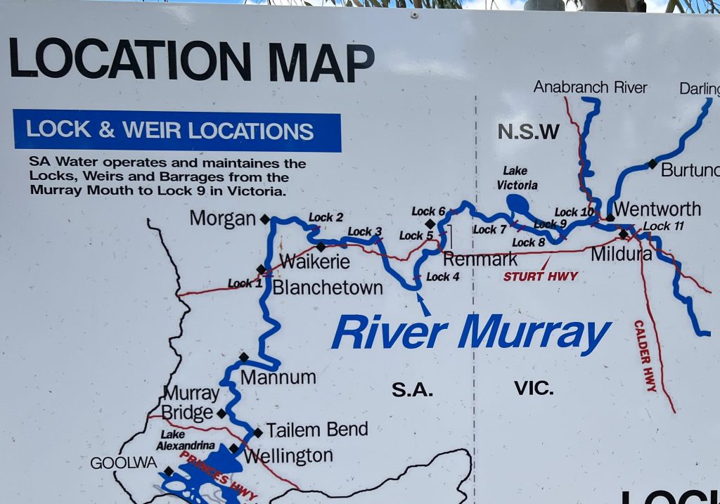 We cross back to the main road aboard the Coot and head 40 km south to Blanchtown. The road tracks along beside the River for most of the way with some great views. Blanchtown is a significant mile post on the journey down the River because it is here that Lock 1 is found, the water level is a little more than three metres above sea level, 274 km from the River mouth. Today 21 thousand mega litres of water are flowing over the weir, in order to maintain the level of the weir pond. Built in 1922 it was the first of 26 locks that were planned to be built on the Murray between Blanchtown and Albury, ultimately 13 were built.