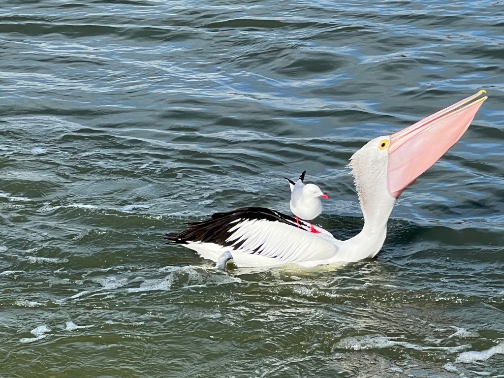The inland port of Goolwa lies several hundred metres up stream from the barrage known as the Goolwa Barrage, there is a small lock on it. We set off on a short cruise aboard the Spirit of the Coorong to the Murray mouth, descending from the Lake through the lock into the Coorong. The barrage was releasing absolutely oddles of fresh water into the Coorong. Pelicans and sea gulls were having a great time feeding on small fish as they came over the sluices, the boat captain suggesting they were mostly carp. Black swans are all about, these birds are apparantly a good indicator of the health of the River. It seems to be good at the moment!