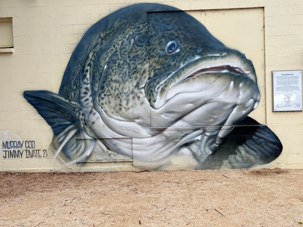 Near the Black Stump is the Silo Artwork on the town’s disused grain silo complex. Looks tremendous, particularly the Murray Cod. These Murray Cod are just getting to Allthego and Homealone. Cod everywhere and big Cod too! An example of old infrastructure providing a town with marketing opportunities.