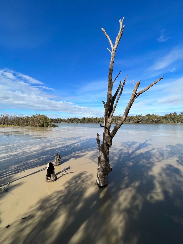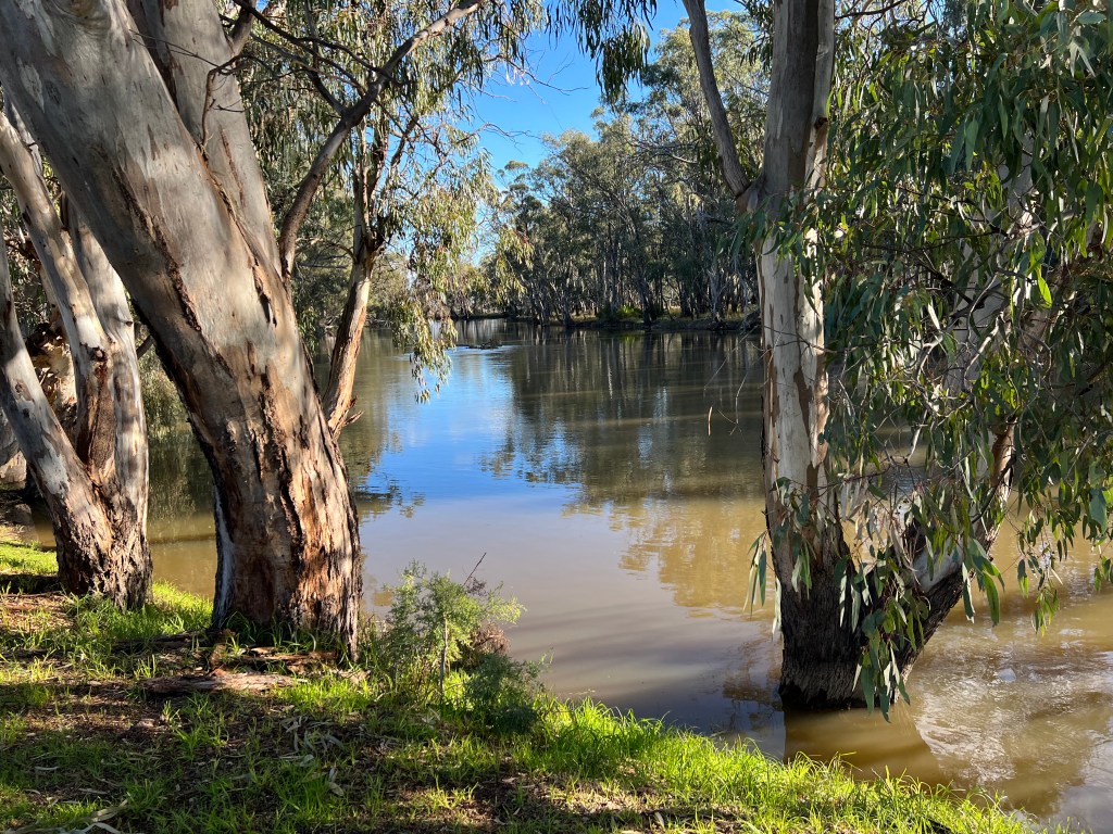 In Hay we stay at a pleasant little van park for the night. Beforehand we had caught some of the latest silo art, celebrating the roles of local WW11 veterans in large as life portraits. A bit different to seeing another Murray Cod! Down at Sandy Point the Murrumbidgee is submerging the shelter sheds along its grassy banks. We have camped here for a night on a previous trip, bit wet now and there are not many vans in residence!