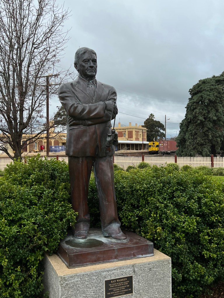 Next morning we hit the road for Cootamundra, another longish drive passing through Junee. Now, I am sure dear readers that you would all know why one would want to divert a bit off a more direct path and travel through Junee? It is certainly the home town of Laurie Daly, famous NRL player. But it is also the hometown of Ray Warren, NRL broadcaster, horse race and Olympic swimming caller for absolutley ages. He has recently retired and I think is nearly 80? One either loves ‘Rabs’ or not, but he is certainly an icon. There is a bronze statue of him just off the the main street in Junee, unfortunately some pidgeons appear to have come past recently and left their mark. We stop for the required photograph.