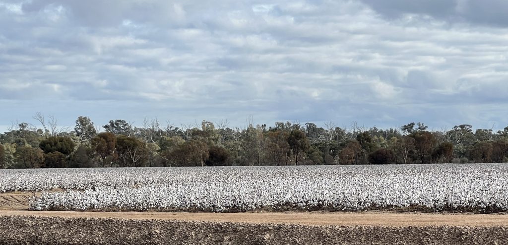The road now leads us onwards towards Hay for the night, along the Murrumbidgee. We have not spent a lot time in this particular part of NSW. It is a region nomads seem to ‘pass through’ on their way either north or south. On reflection it is a pity because the environment is quite special. The famous Hay plain is really the bottom of the ancient sea that covered this area many moons ago. Now the irrigated farmlands of the Murrumbidgee are part of Australia’s great food and fibre bowl. Cotton is being ‘picked’ as we pass along. The roadside is scattered with tufts of the white stuff and cotton trucks fly past loaded to the brim. It seems to have been a good season. Sheep are everywhere, packed into green paddocks up to their knees in grass!