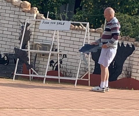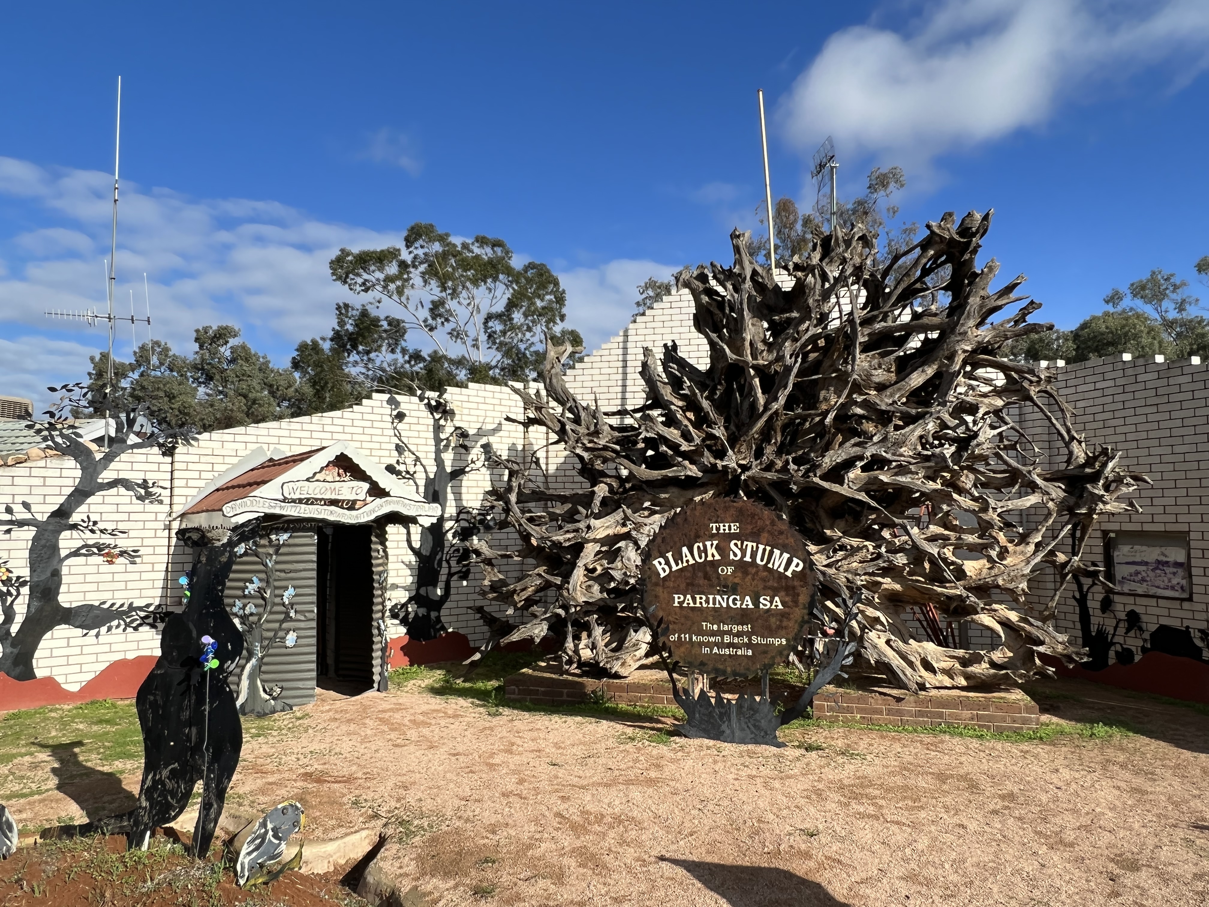 Earier we called into Lock 5 at Paringa. The locks are all looking the same but the nearby Black Stump didn’t. Apparantly, our biggest of eleven black stumps around the country. It was big. In front of a house that had some metal cut out Murray Cod replicas for sale. Allthego couldn’t resist one of these craftwork icons and picked a good one up for a bargain price. The marble eye is a bit wobbly but can be fixed later. Will look good down by the pool at Bedwell Place.