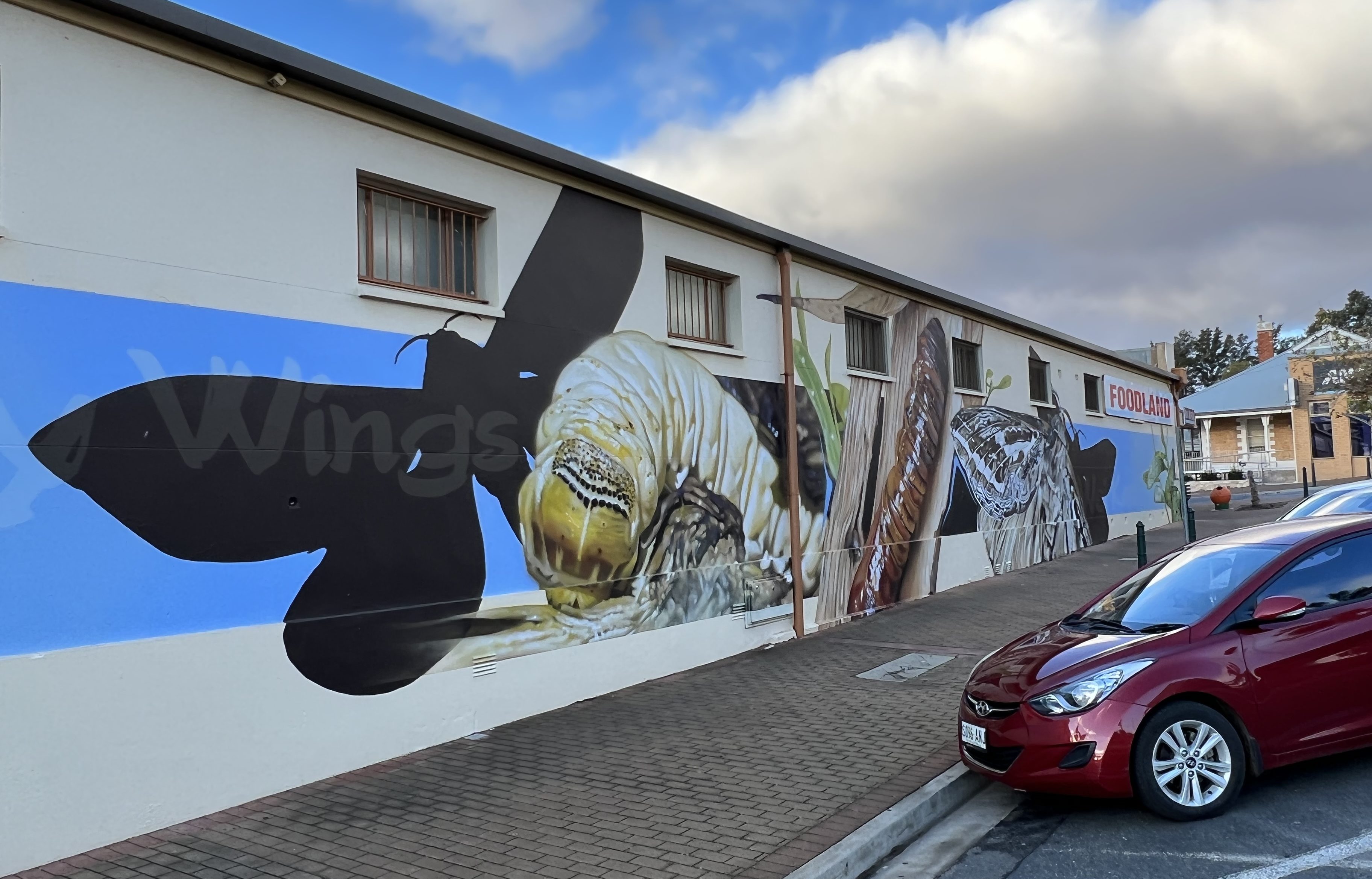 ‘Waikerie’ is derived from the indigenous word for the Rain Moth, an insect prevalent in these parts it seems. A mural on the local Foodland store depicts the life cycle of the moth. Allthego gets a bit frustrated with these murals that are at street level and surrounded by cars, rubbish bins and various signs! Homealone though says that this is what it is all about ‘street art’, put up with the distractions and appreciate the art! How true and a wise comment!