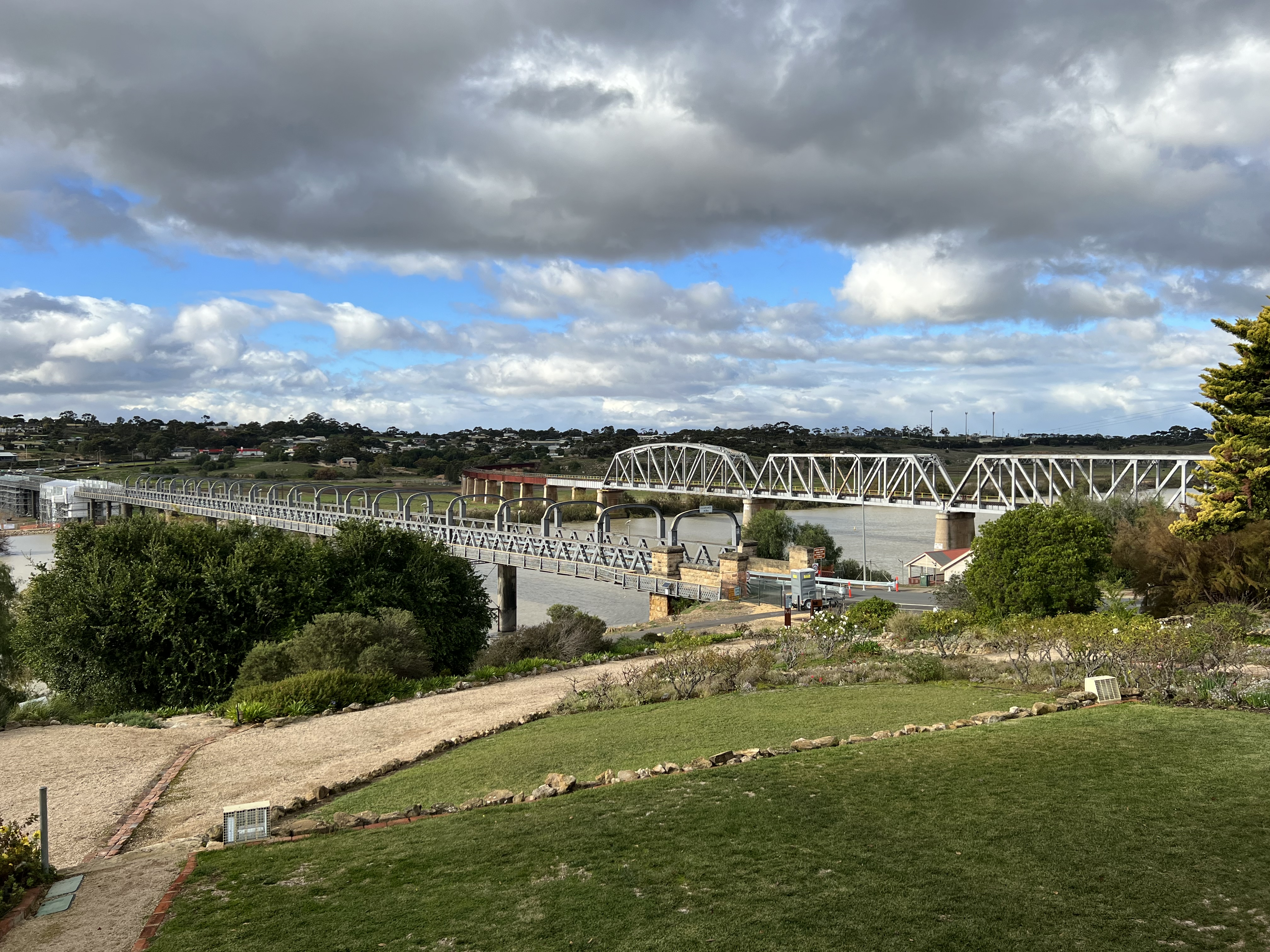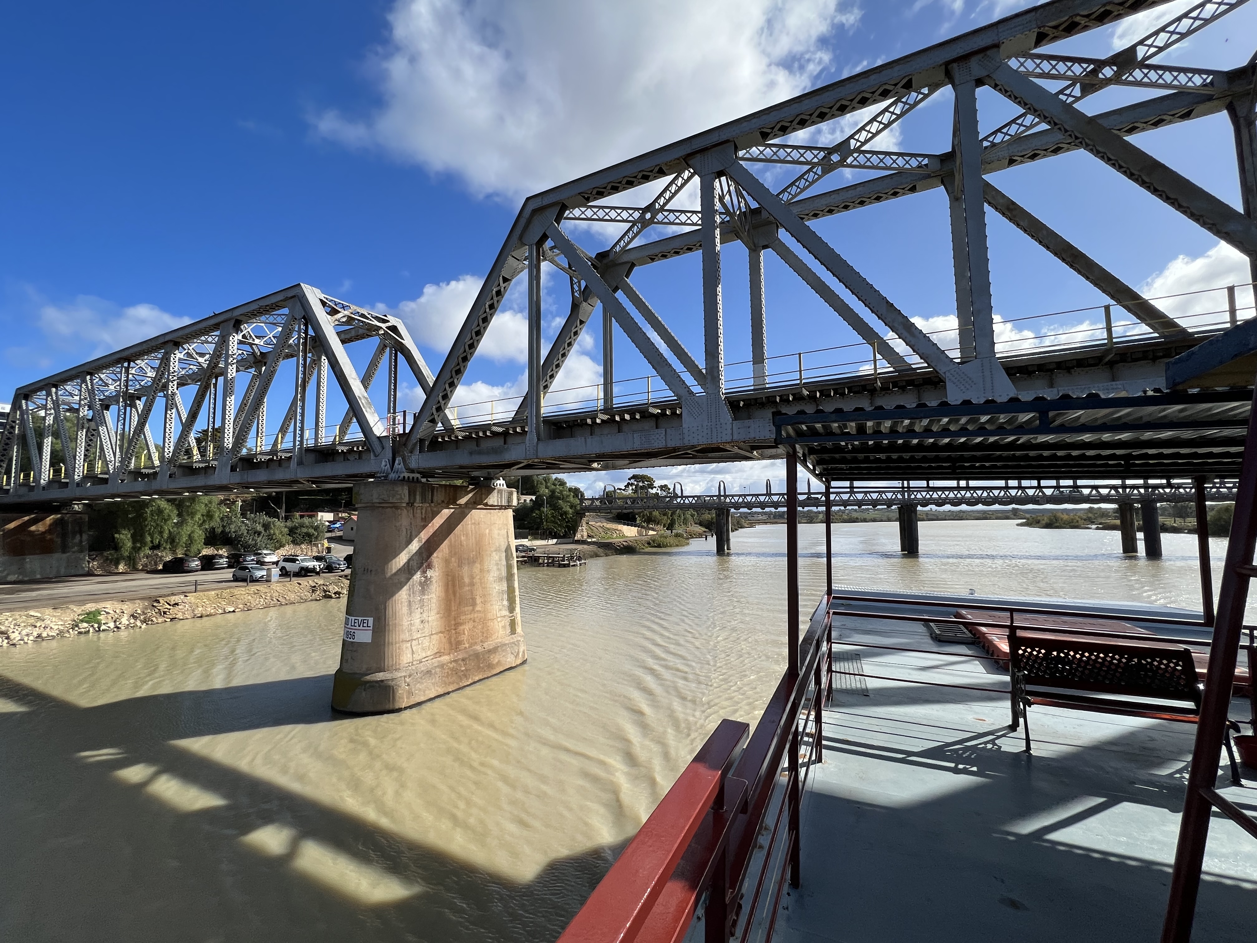 Murray Bridge draws its name from being the location of the first the bridge across the Murray River. Completed in 1879 the Bridge crosses the River and flood plain in a broad arc and is a great sight. The bridge originally carried a rail line but this was relocated to the dedicated rail bridge alongside. Today there is some extensive work being done on the Bridge to keep it in action into the future. There is a great view of the bridges from the Roundhouse, perched on a hill overlooking them. The engineer who built the first road/rail bridge lived in the Roundhouse while it was being constructed, keeping an eye on progress no doubt from the verandah.