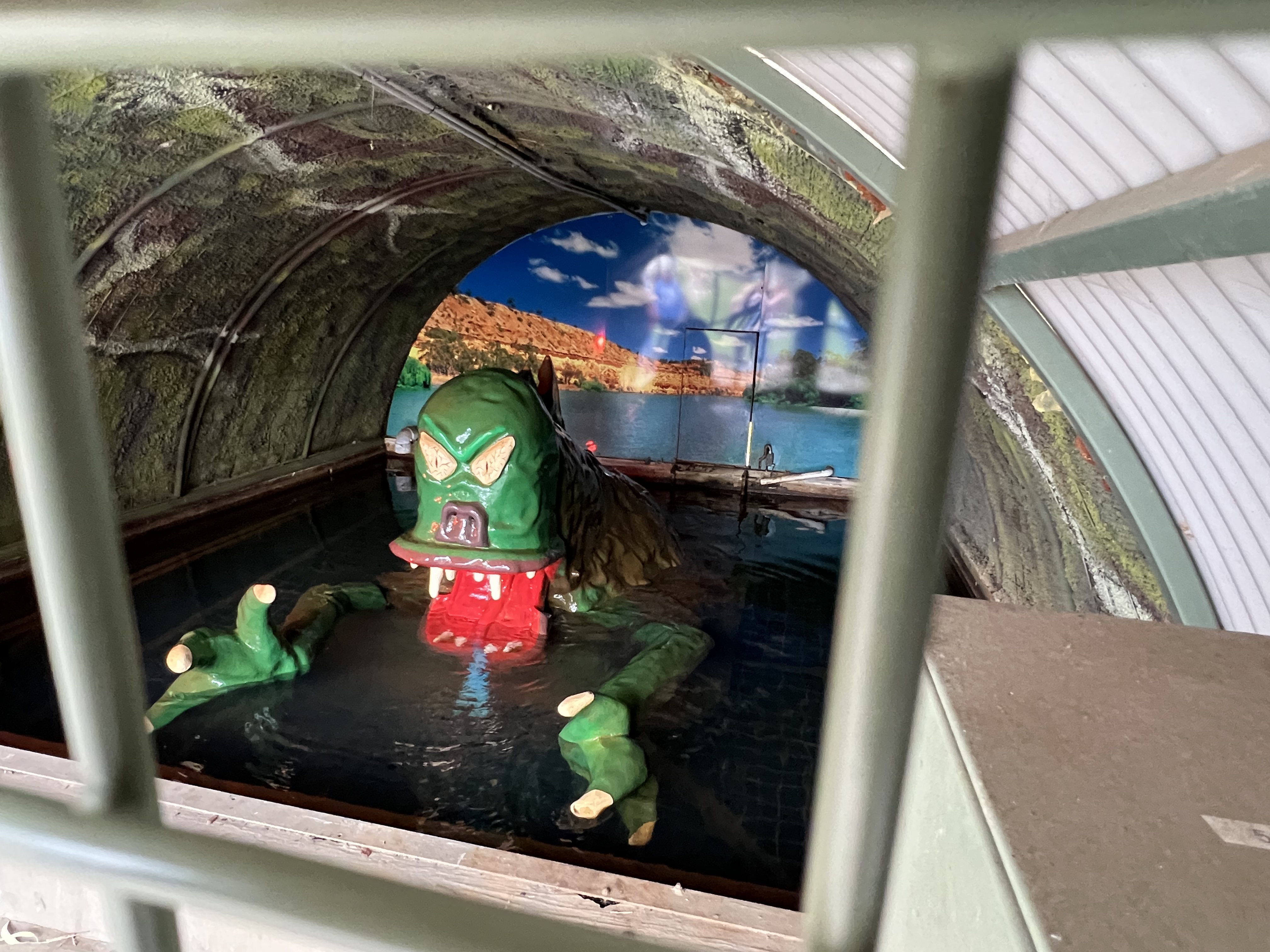 There is a pleasant park along the riverfront and it is here that we find an iconic Murray Bridge attraction. A Bunyip cave is located beside the River, it has been here for over 50 years. The resident Bunyip is most active and makes appearances for onlookers at five miniute intervals, flashing lights and a lot of screeching emanate from the cave as the Bunyip rises from the depths of its billabong. Most impressive! One onlooker says to Allthego that the Bunyip looks more like an alien. Allthego agrees and says that it looks nothing like a real bunyip. The onlooker was a little puzzled, Allthego just grinned a bit and returned to the truck.