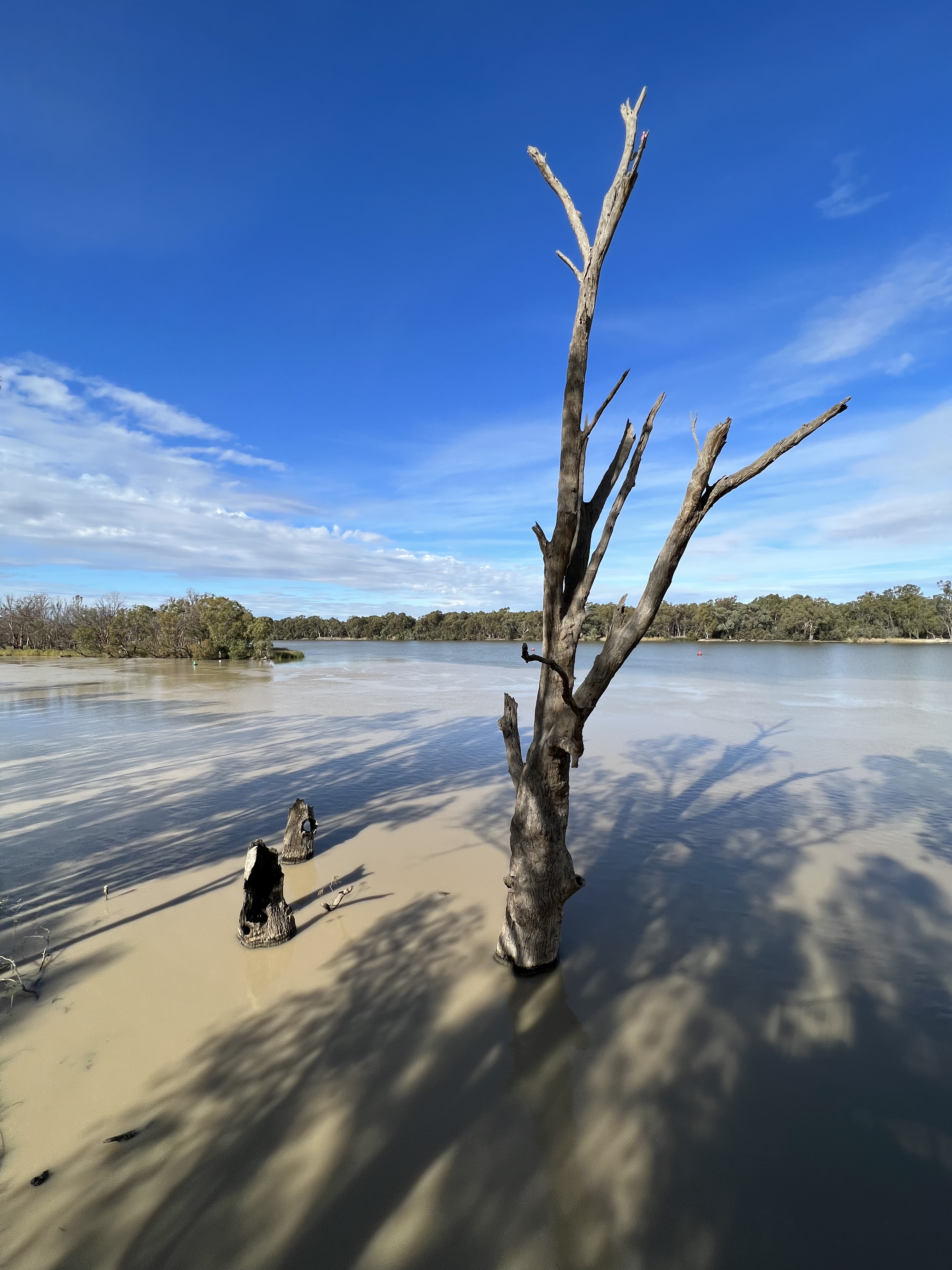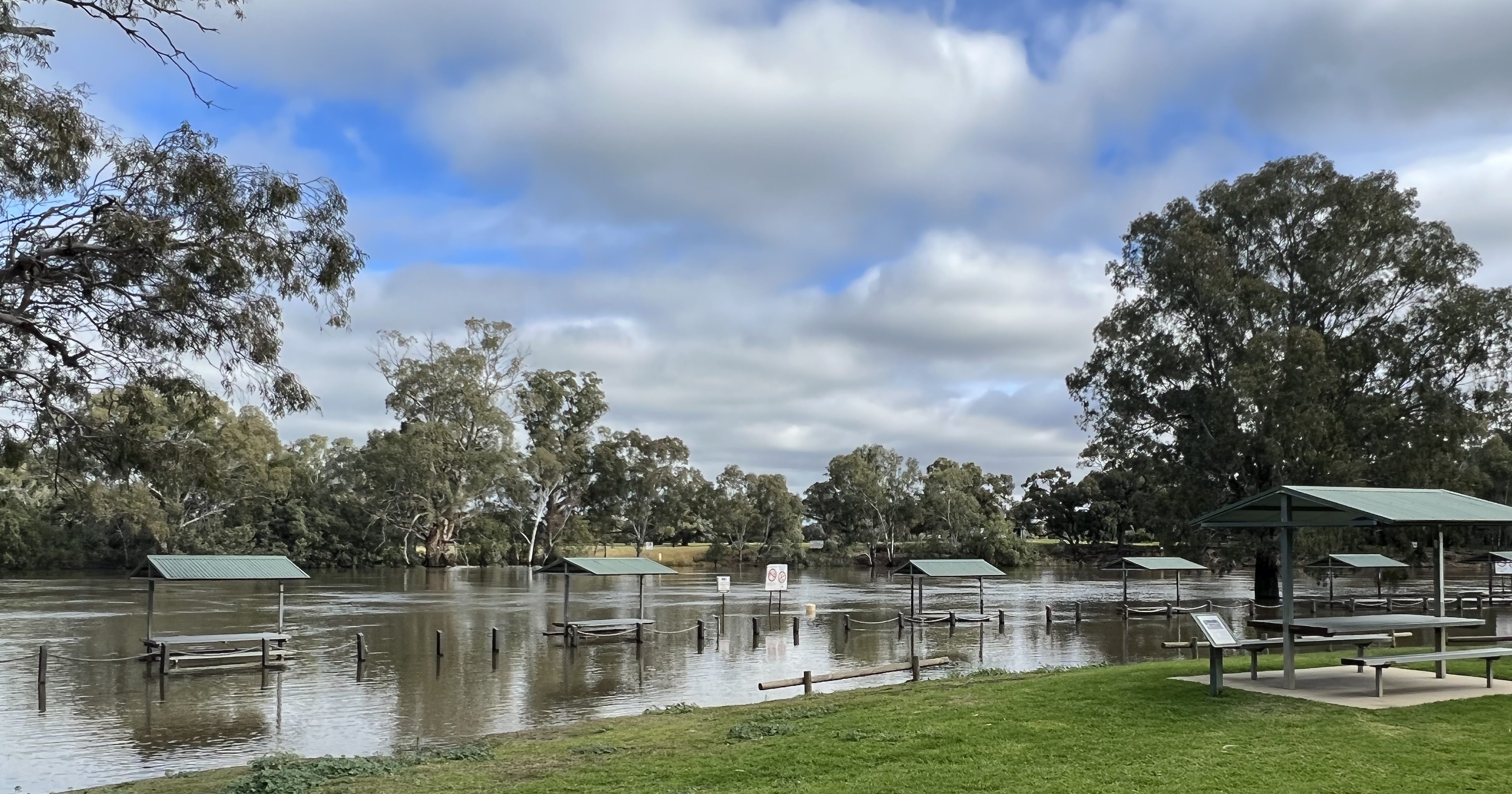 In Hay we stay at a pleasant little van park for the night. Beforehand we had caught some of the latest silo art, celebrating the roles of local WW11 veterans in large as life portraits. A bit different to seeing another Murray Cod! Down at Sandy Point the Murrumbidgee is submerging the shelter sheds along its grassy banks. We have camped here for a night on a previous trip, bit wet now and there are not many vans in residence!