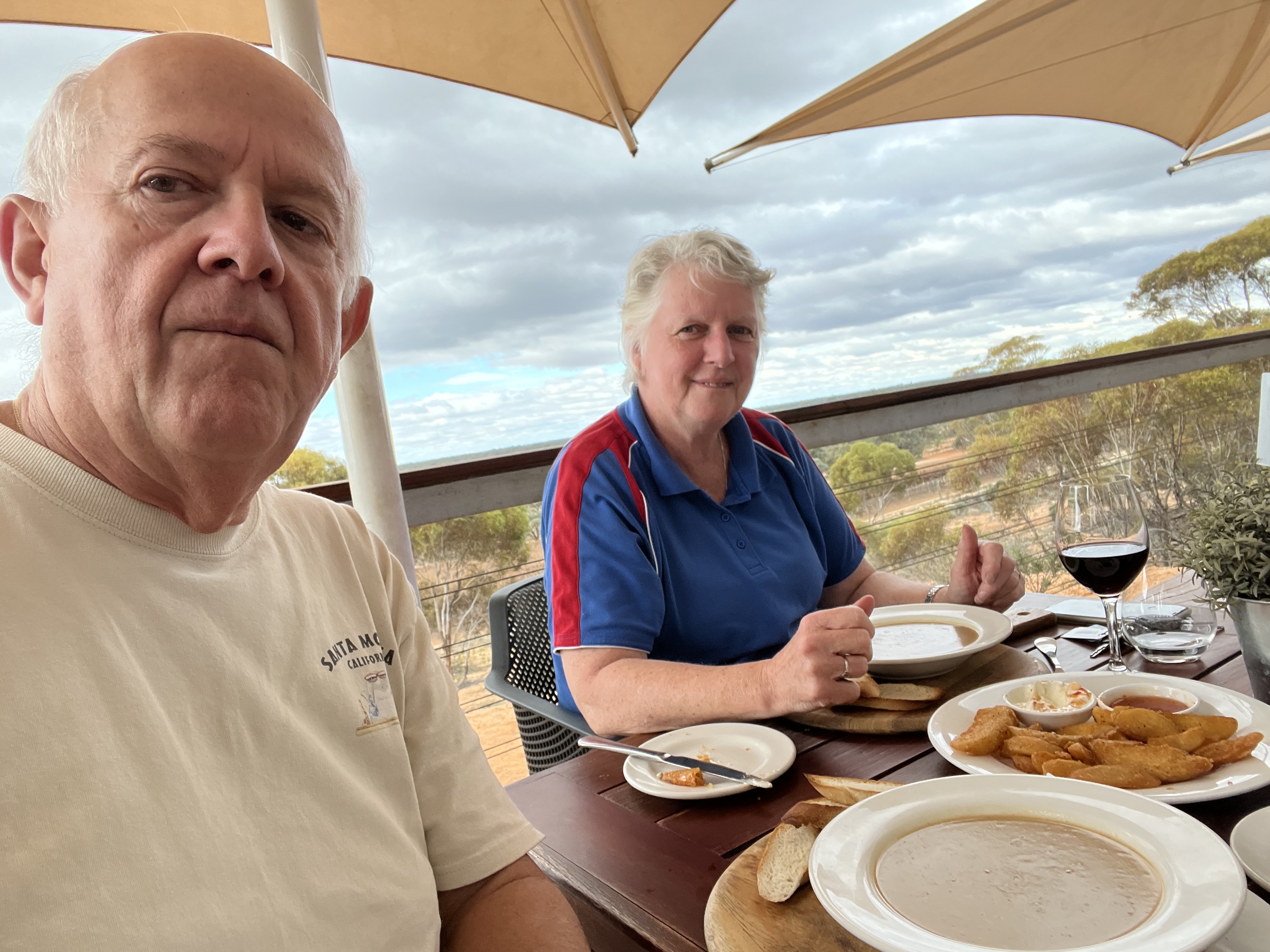 We are now at Balranald beside the Murrumbidgee River, a tributary of the Murray. It is in flood and the Park manager has told us it is on the rise. A nice sunny day on the road but it is chilly as the sun sets. Allthego’s beef stew by the fire! I suspect we will survive the night as we continue east in the morning to Hay.