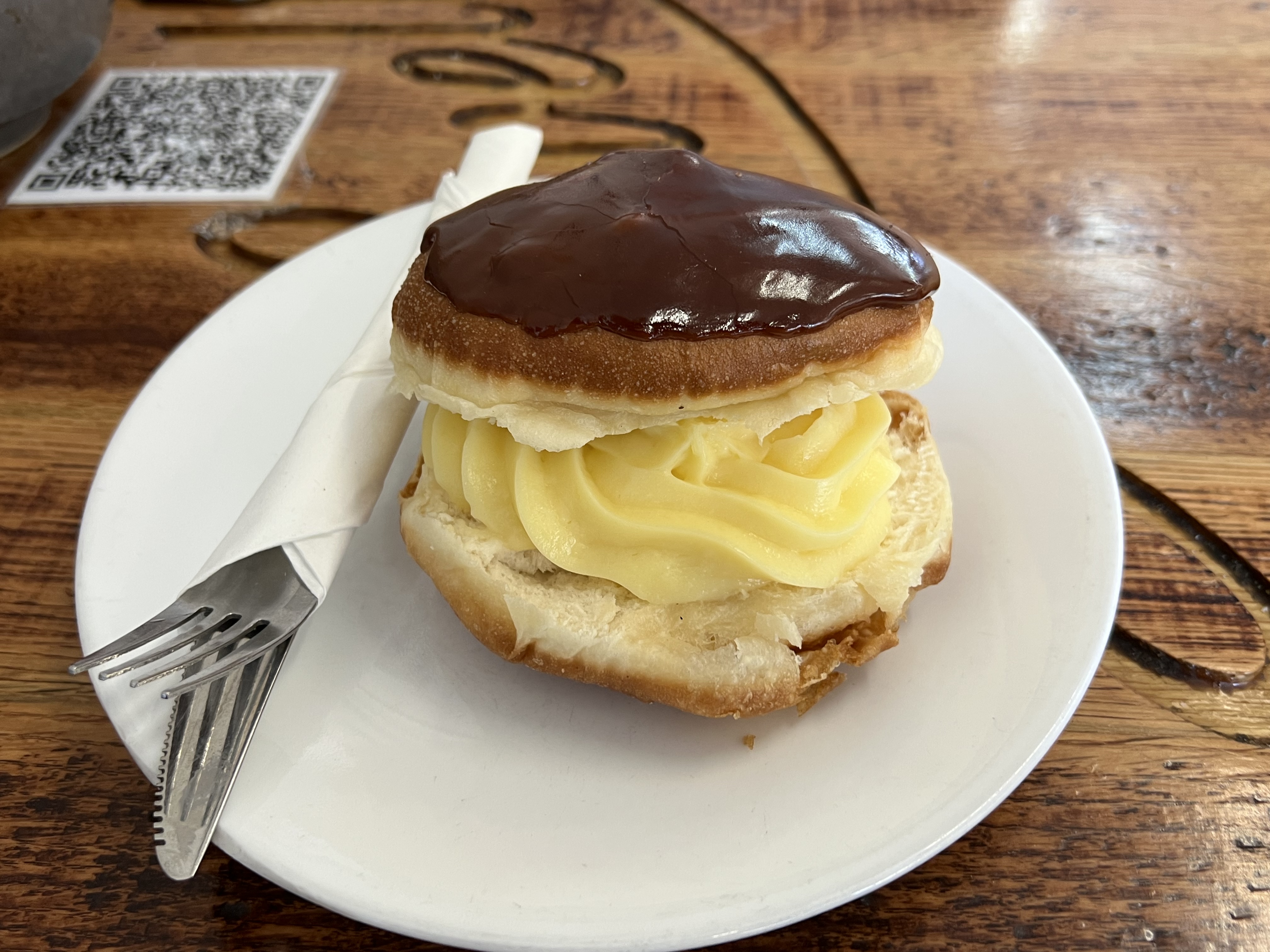 The custartd tart tasteoff continues in Mannum. Considerable disappointment though as the tart from Waikerie and the Mannum tart just don’t stack up. Both exhibit the problem identified earlier, the casing is not cooked, meaning the base is soggy and not very appealing. Fortunately, Allthego spotted a berliner in Mannum and couldn’t resist. Maybe we will test run berliners on the next trip? This custard filled German style donut was great. There are no holes in German donuts, this is an advantage because the custard doesn’t fall through the hole and instead oozes out the side mixing with the chocolate icing on top! Mmm!