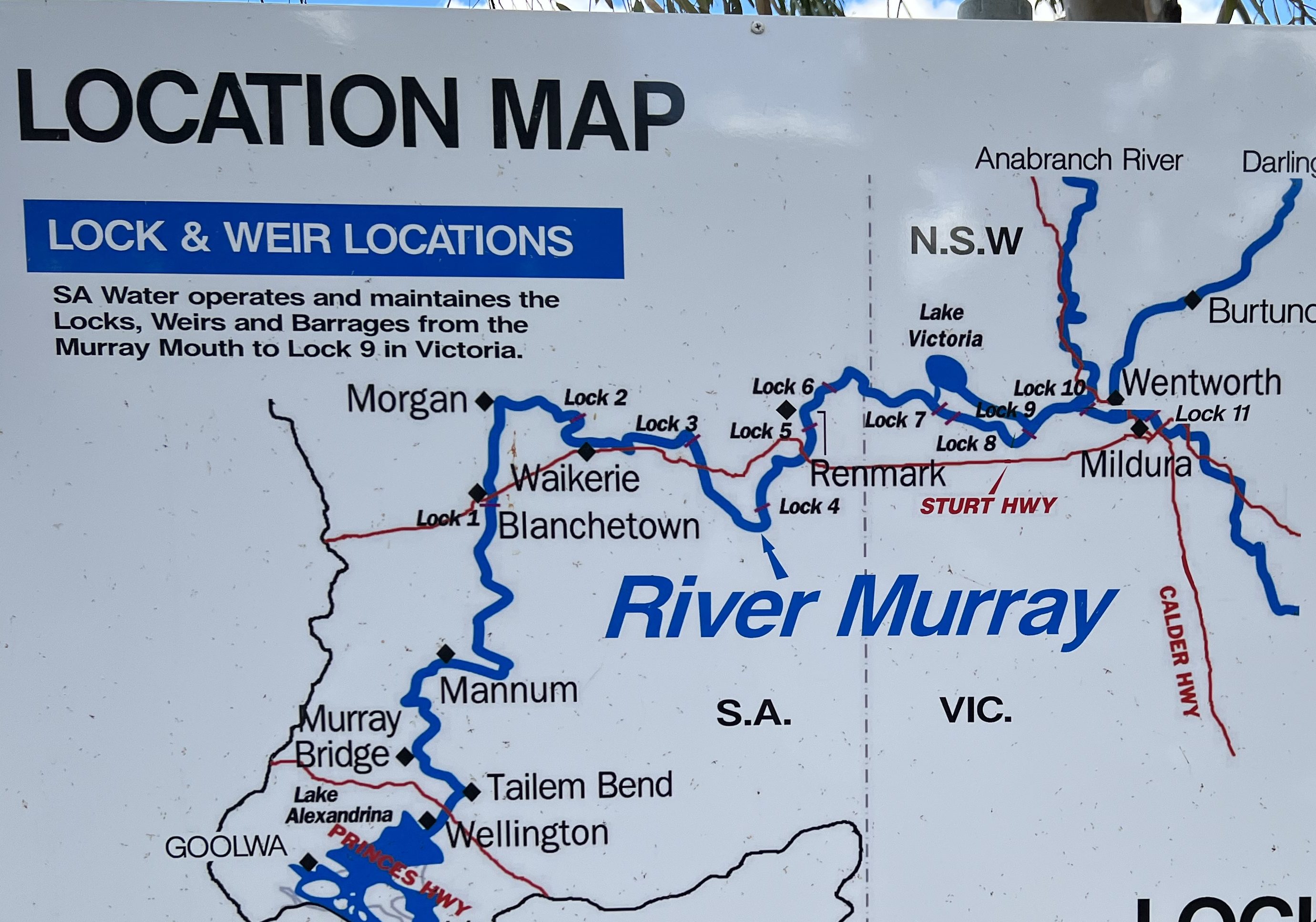 Allthego has had some time to reflect on a map of the journey from the headwaters of the Murray to where we now are, Goolwa. In a simple over view the River flows more or less north from Tom Groggin in the Snowy Mountains before looping around and heading west towards Albury and on to Echuca. From there it is north west up to Mildura and Wentworth, where it is joined by the Darling River whose source lies far to the north in Queensland. At Wentworth the River starts to track west towards Renmark and Waikerie, well to the north of Adelaide. The River then kicks up a bit to Morgan and then abruptly turns south for about 300 km to the sea at Goolwa. Why has it suddenly done this abrupt plunge south? Has it run out of energy, no longer seeking the arid interior and decides instead to take the easy route south down to the sea? A theory is that about 50 m years ago the rise of the Lofty Ranges to the east of present day Adelaide changed the course of the Murray which at that time flowed into Spencers Gulf, well to the north of Adelaide. Seems an interesting concept that explains the abrupt shift in its course.