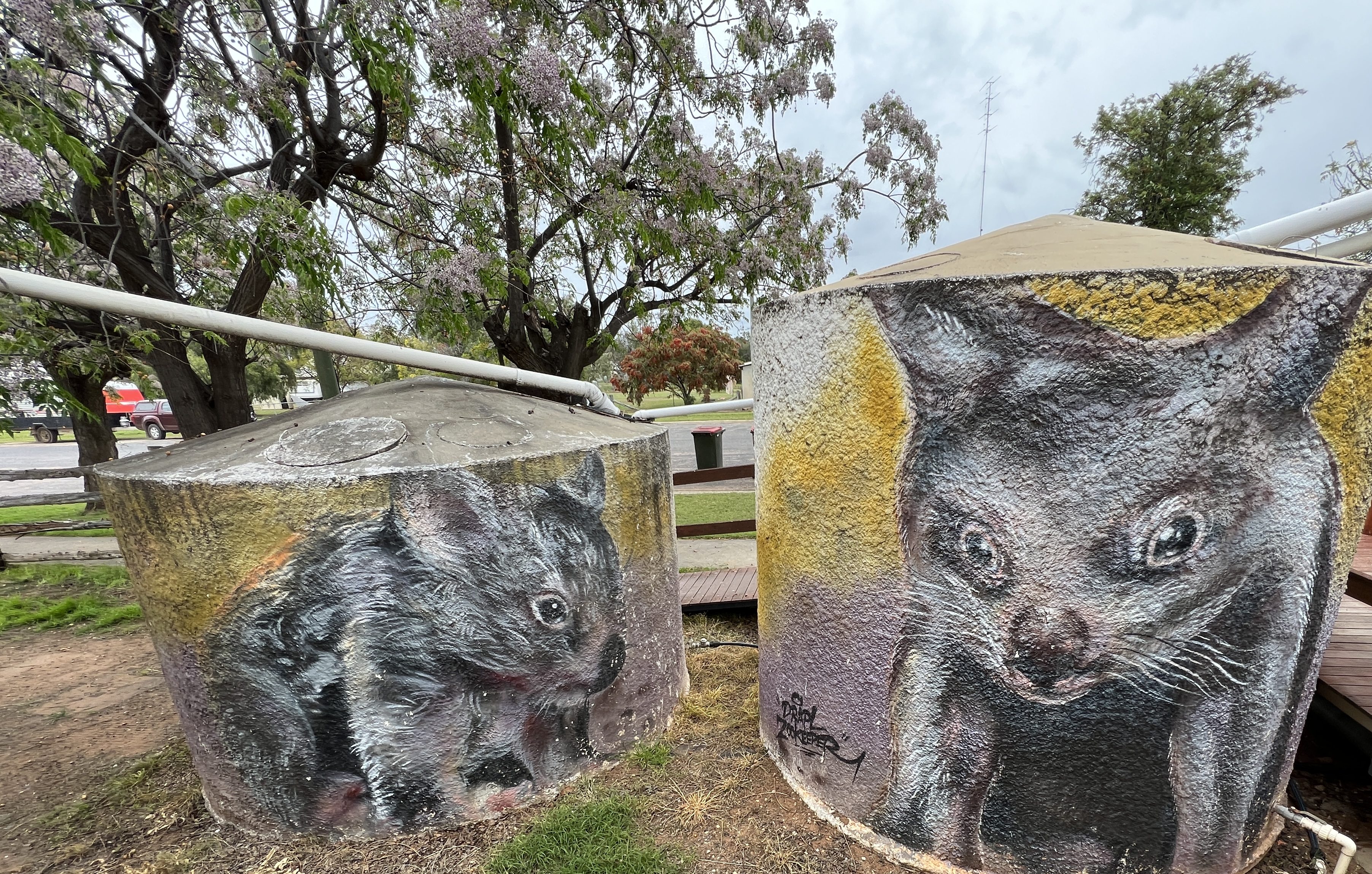 The hotel also has two murals of the Northern Hairy Nosed Wombat on their water tanks. These icons are critically endangered but were once common around here.