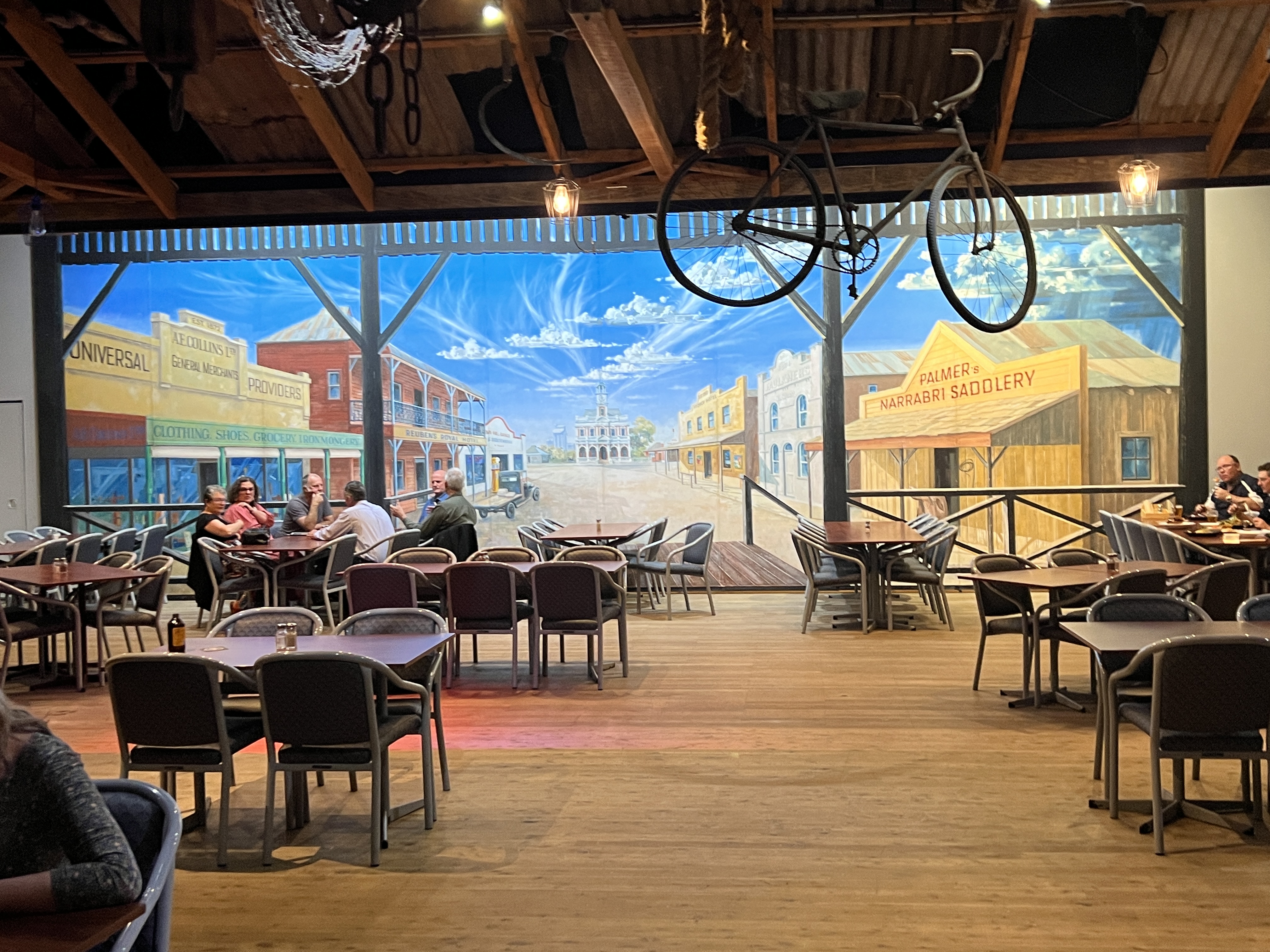 Back into the truck we headed for Narrabri for the night. Made it and set up just before the rains started. Had fish n chips for dinner at the nearby RSL. Their dining area is set up as an outback bar and grill, a rustic set up harking back to the 1800s with a back drop of a big mural of the town. Very different set up to the usual RSL dining areas! Can recommend it, fish n chips not bad either.