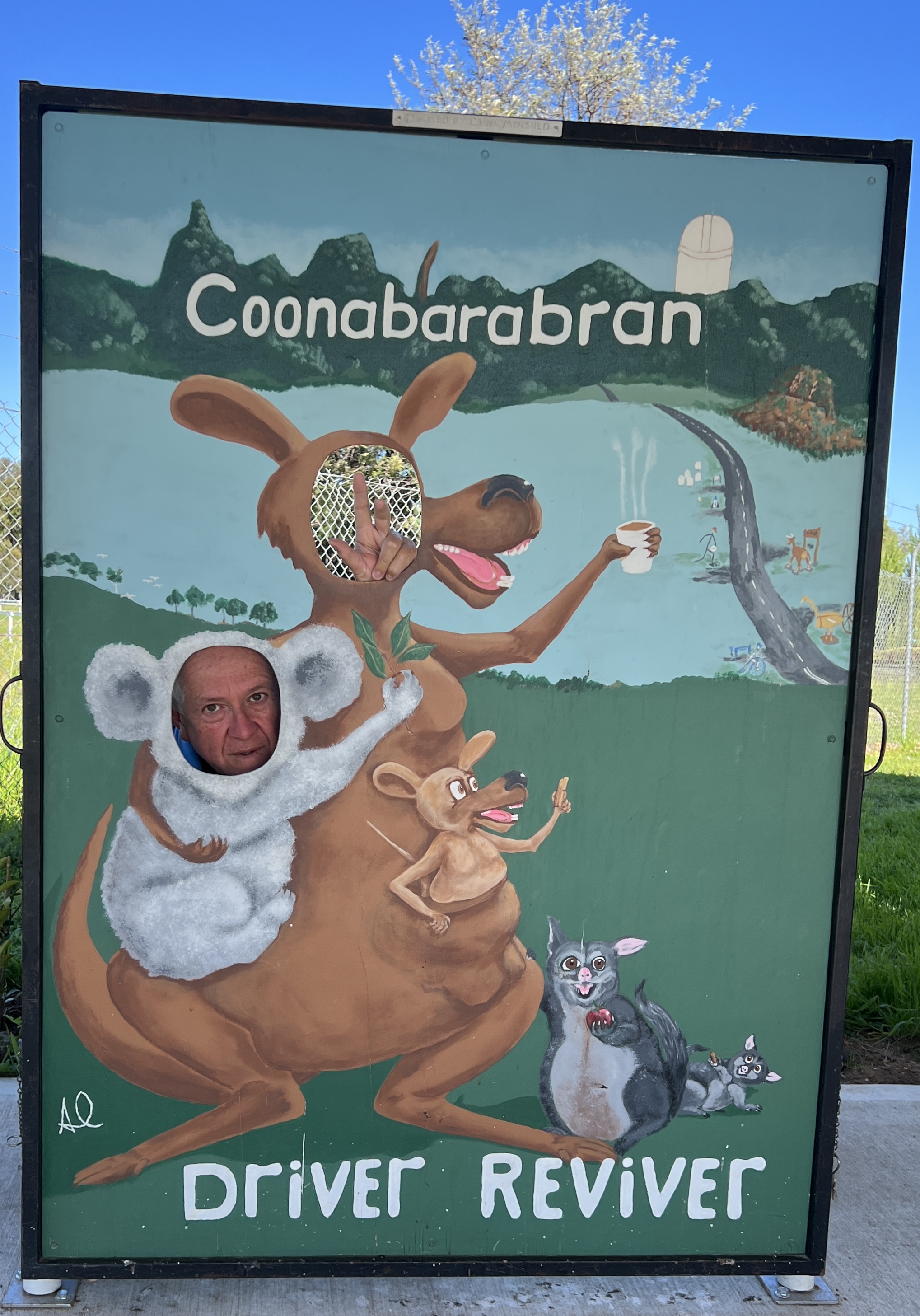 Back in town we had a look around the street art, mostly done by the local John Murray. He has a gallery in town, specialises it seems on emus. Lots of other works that all tend to be of a humorous nature.