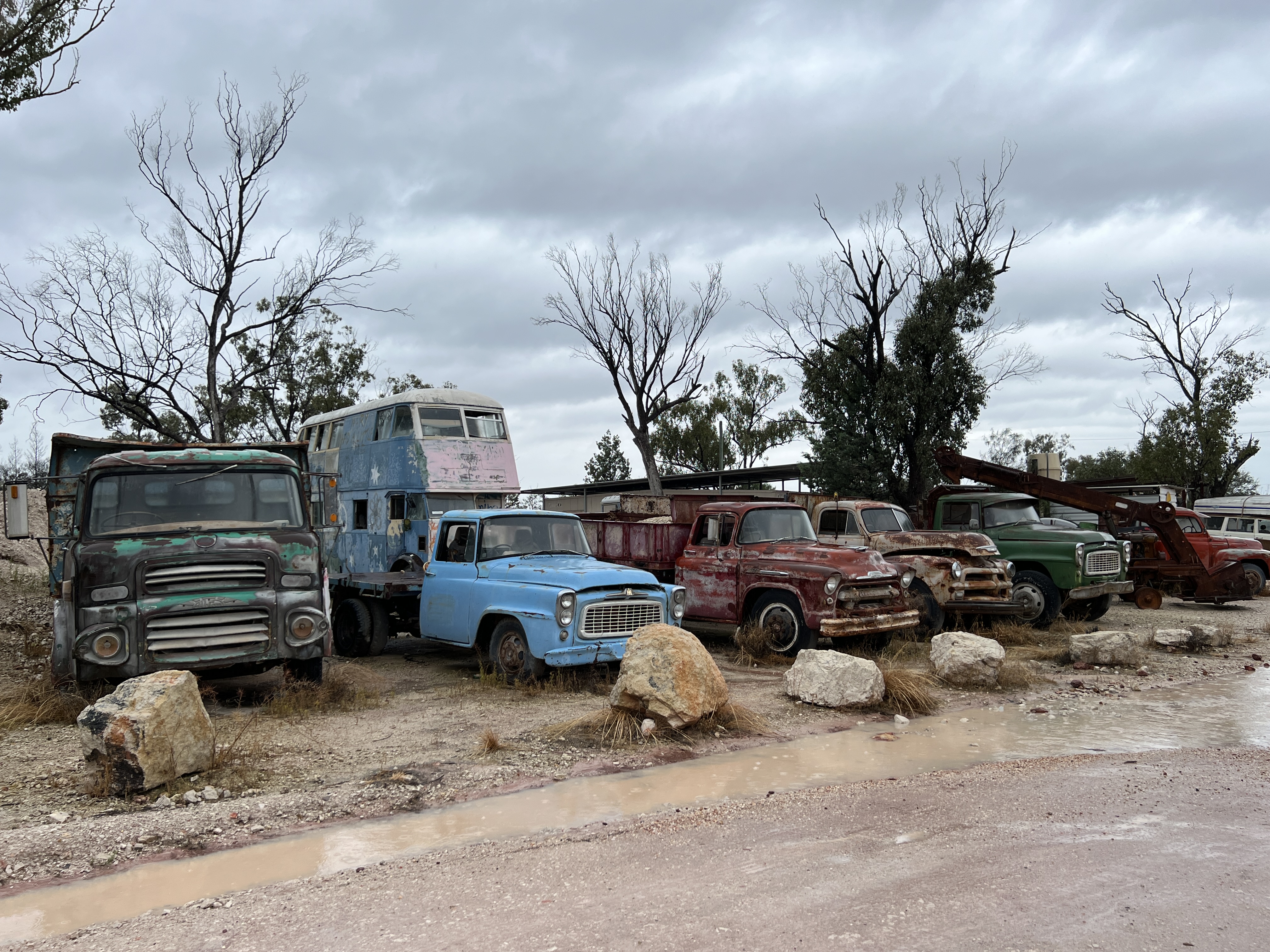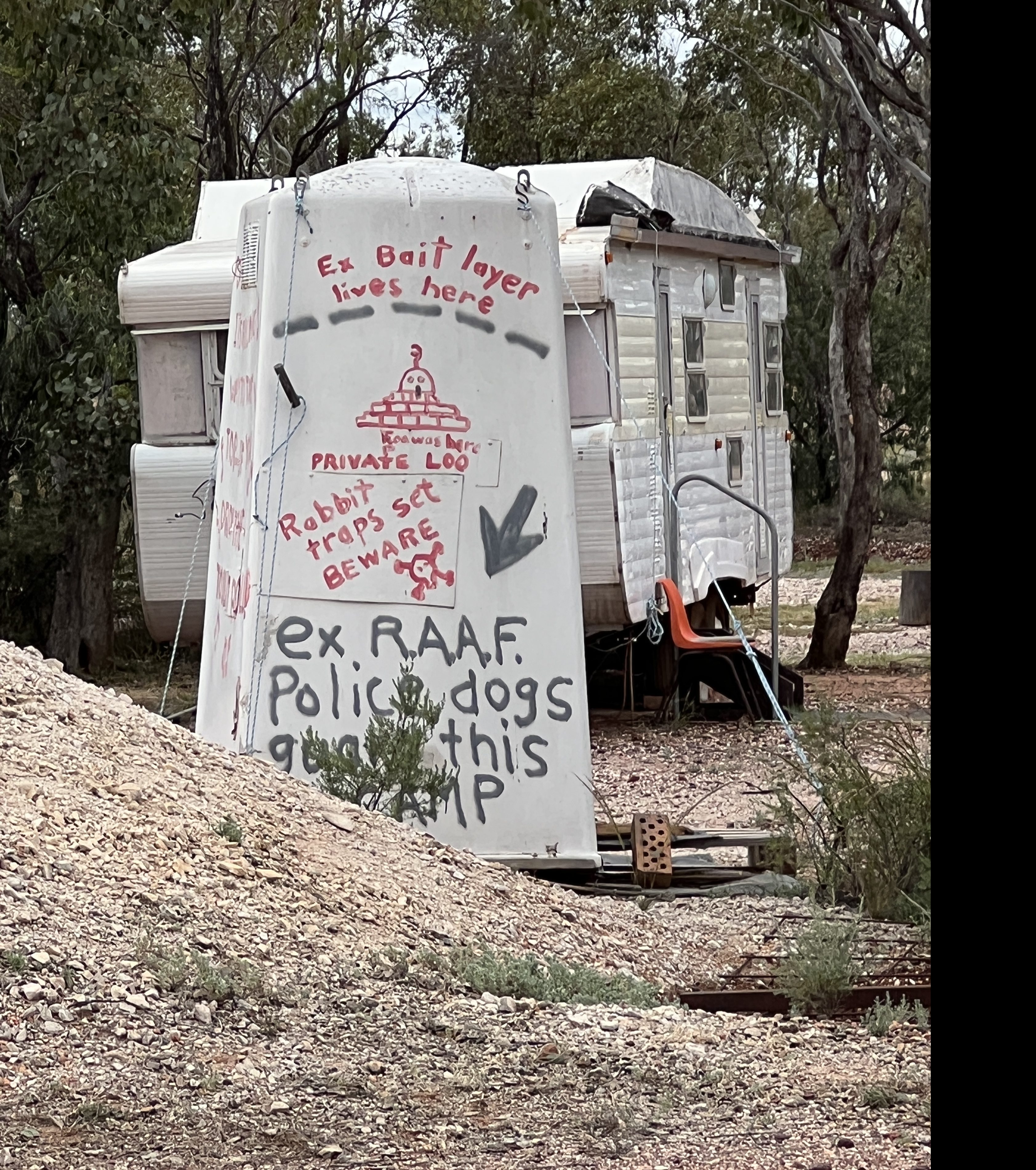 Lightning Ridge is a quirky place. The township is surrounded by opal mining activities, largely conducted by sole or family operators. Not something for large scale company outfits. The miners tend to live on their claim in what can best be described as shanty type accomodation. Old caravans and tin sheds, containers. Yesterdays ‘Tiny Houses’ that are currently the vogue among some! There are a few more substantial shacks made of local rock. Old equipment lies around rusting, old cars seem to have been left where they have stopped. Some of the miners come to their claims to mine during the winter months, gets very hot here in summer.