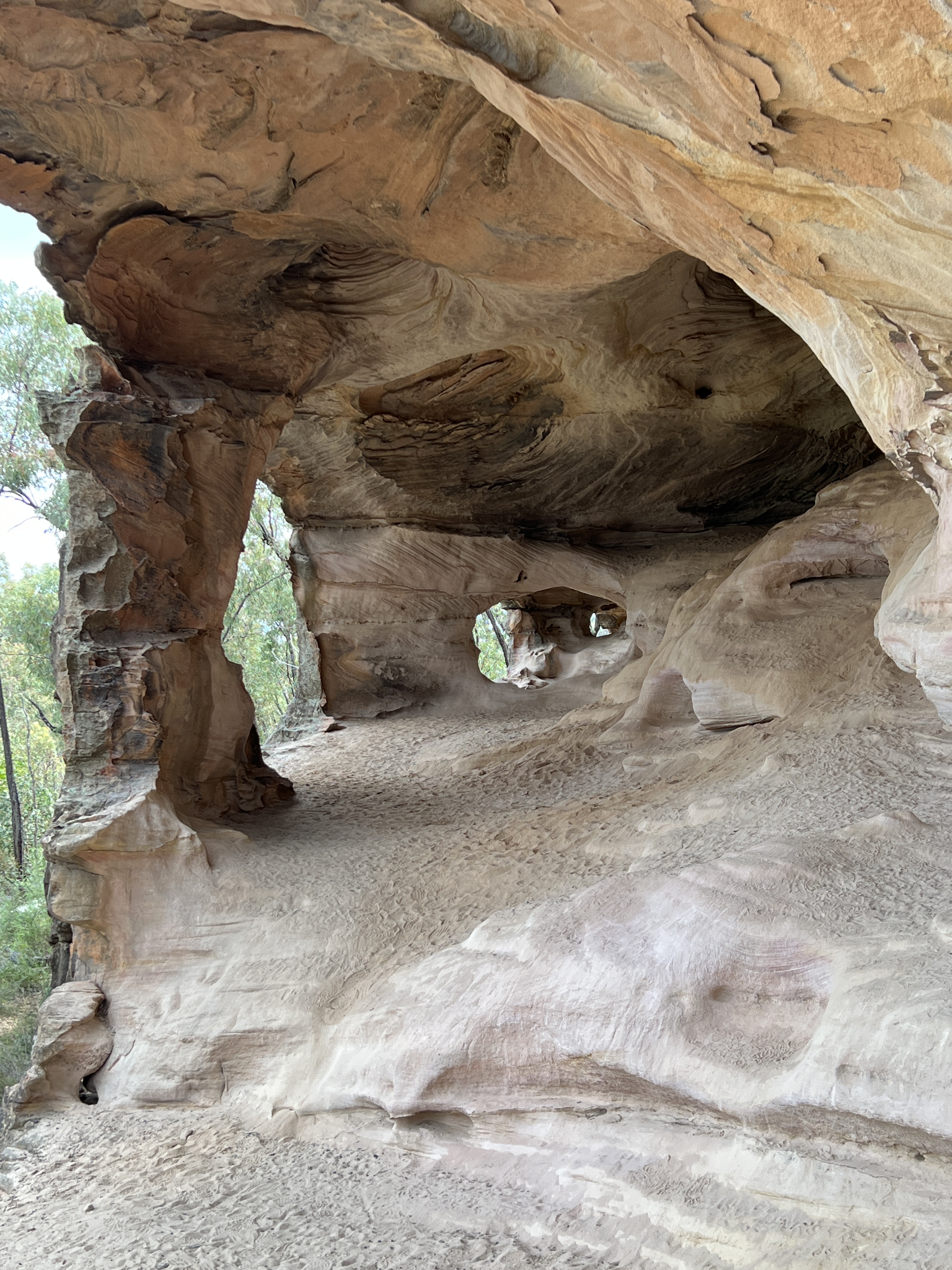 The walk takes one around a large outcrop of sandstone. Pilliga sandstone is very soft and the cliff face of the outcrop has been eroded and hollowed out by water and wind creating a series of caves and overhangs looking out over the Pilliga Forest.