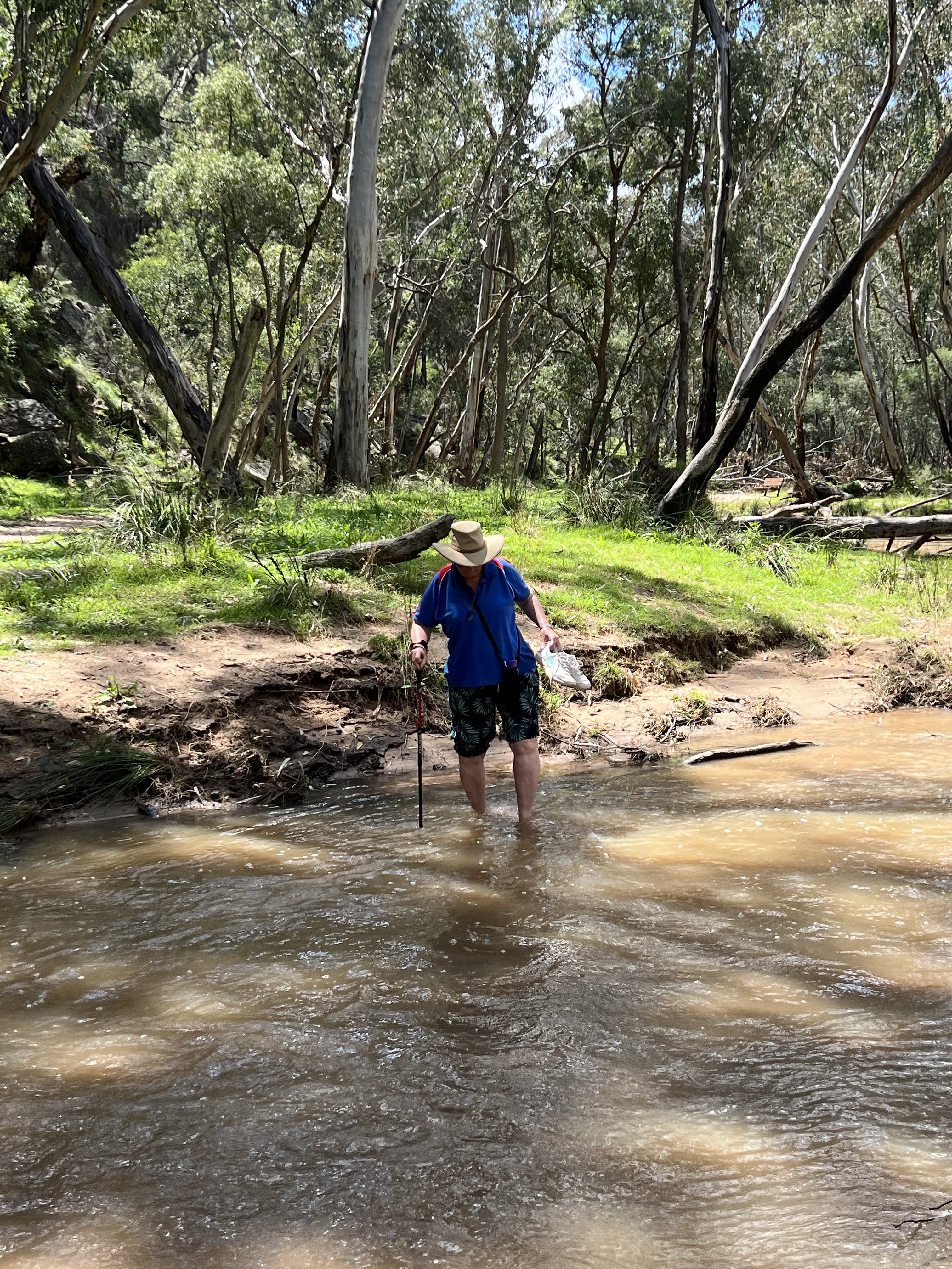 The walk slowly descends into the Dandry Gorge, and then follows the creek for a while. Very cool environment down in the gorge. After a while the track disappears into the creek. Homealone and Allthego need to remove shoes and wade through the creek, not as cold as we thought it might be!