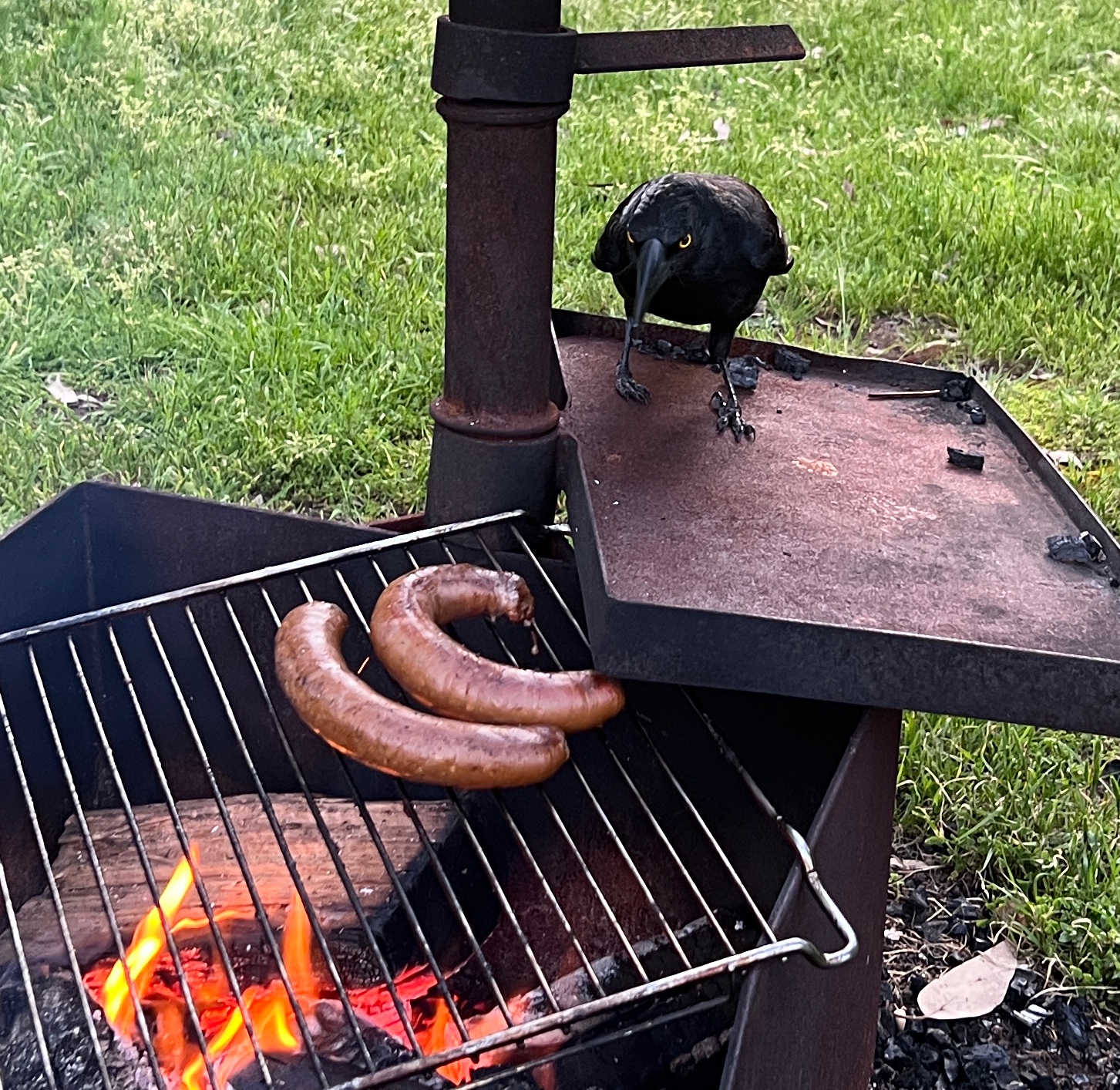 Had some snags on the BBQ for dinner, watched on by a cunning Currawong.