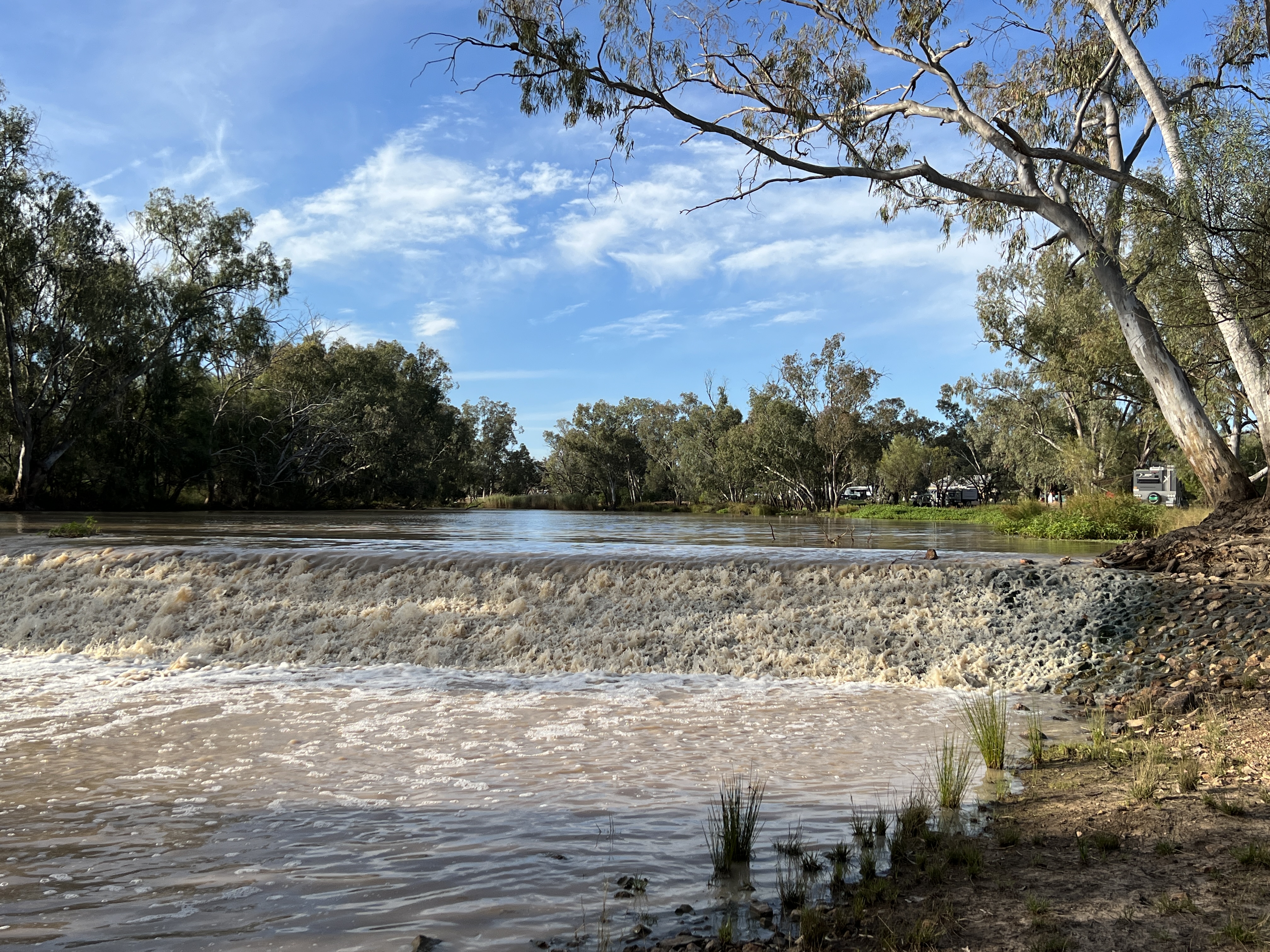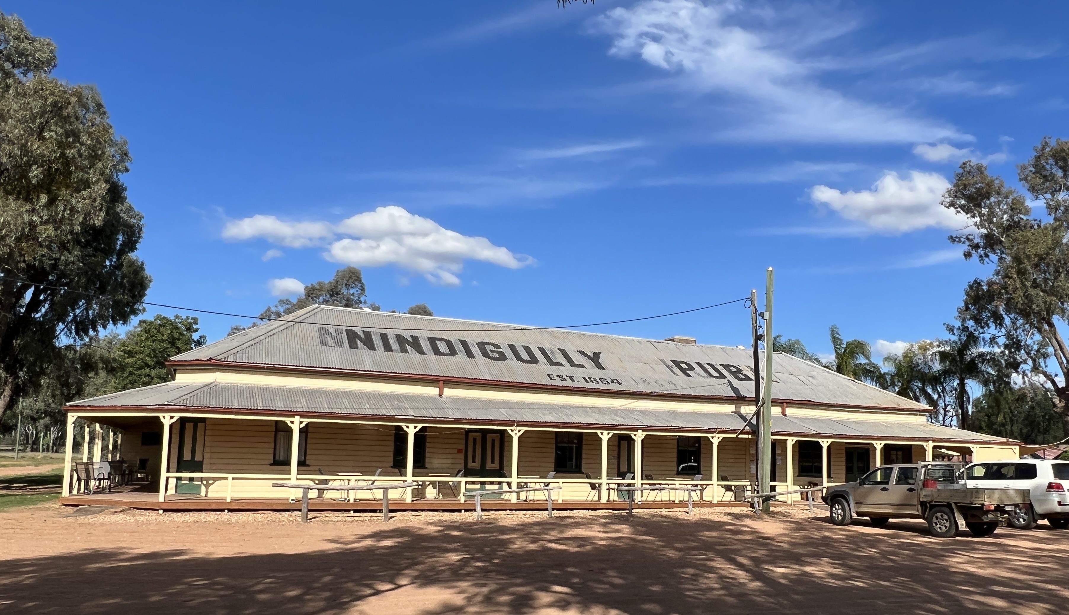 The pub at Nindigully is a Queensland icon. It was established in 1864 and is the longest continually licensed pub in the State. It sits perched above the Moonie River, free camping sites stretching out between the river and the pub. Several hundred people could camp here, particularly for the annual pig races. The river is full of water and cascading over the weir below the hotel.