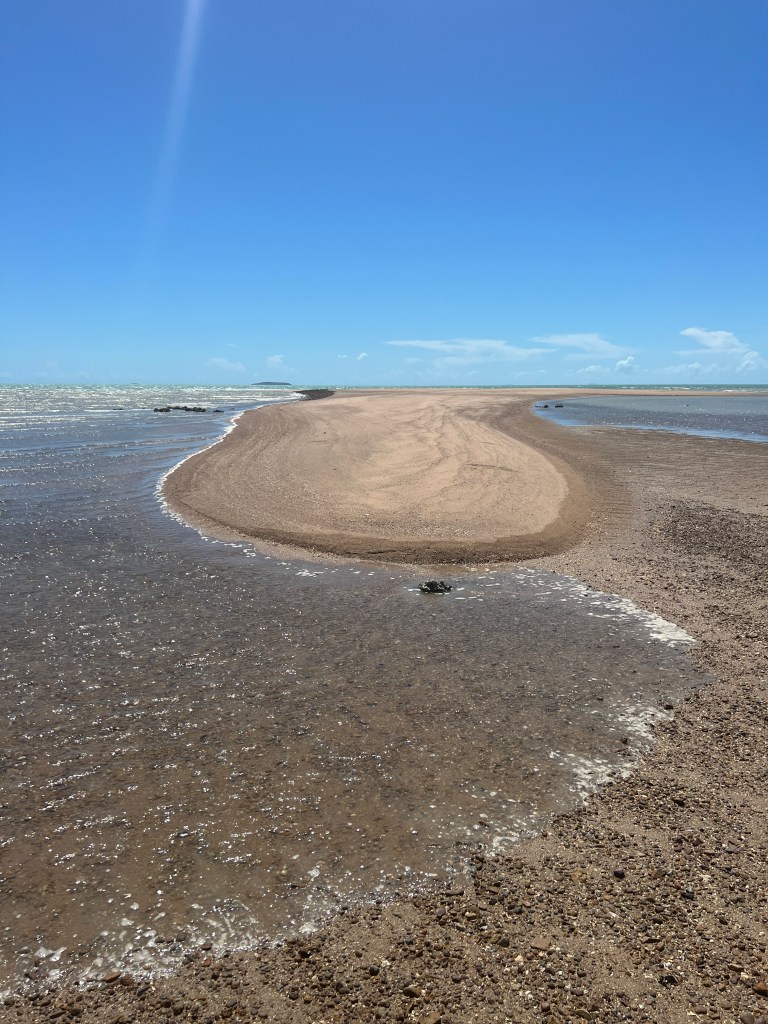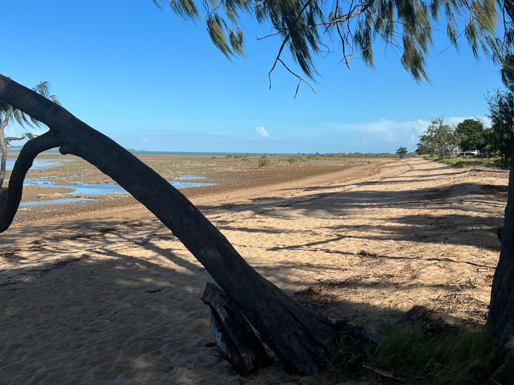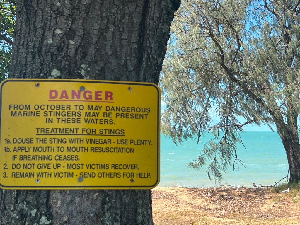 Aside from dugongs Clairview is home to a good supply of mud and sand crabs. Barramundi are also supposed to inhabit the creeks. Hence the name of the park, Barracrab. As usual up this way at this time of year the sea can have those unpleasant jellyfish and warnings are aplenty. We didn’t see a barramundi or a crab, except on a crab sandwich at the camp bar. Rather good, lots of crab too!