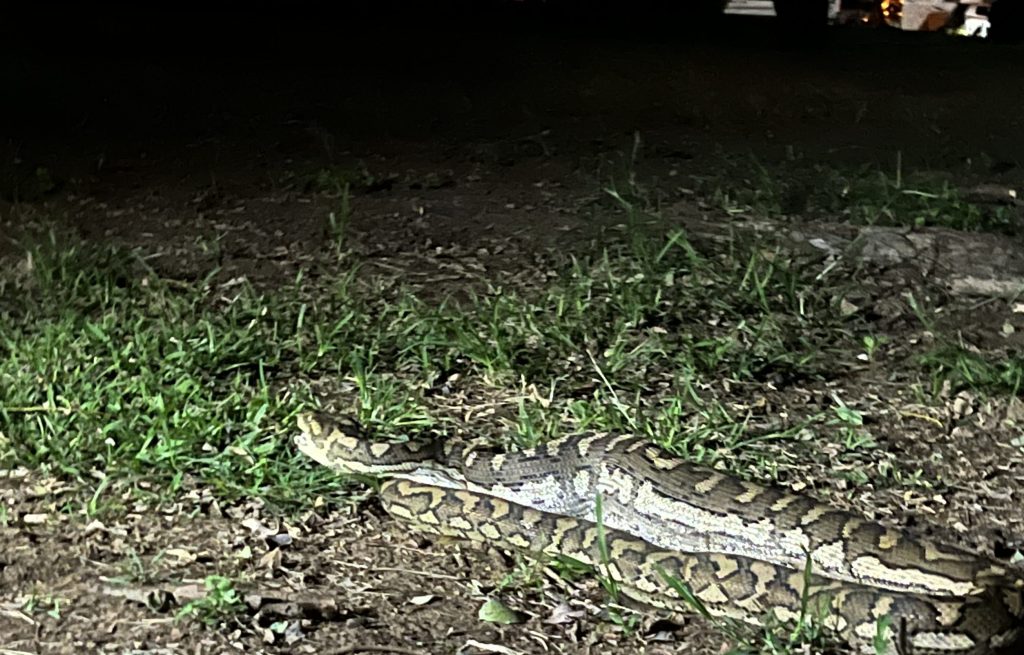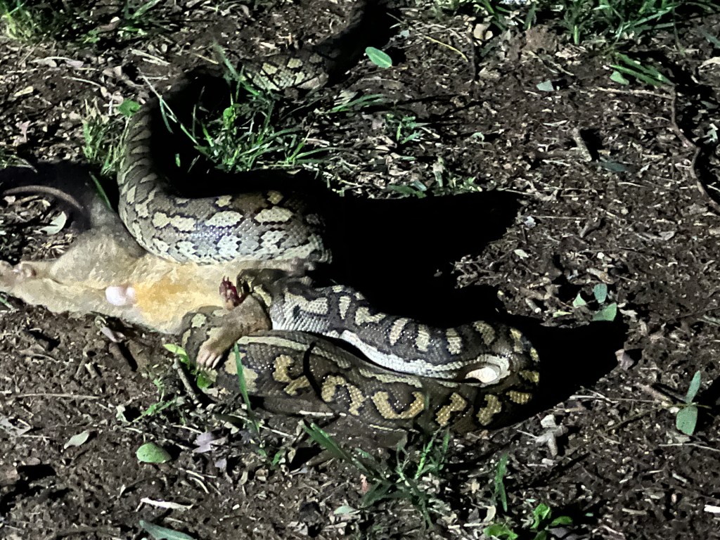 We have also had some in camp excitement with a python devouring a possum one evening next to our campsite. Could have trod on it when wandering off to the bathroom. It was not a big python, but it still cleaned the possum up quite quickly and then slipped away to digest it.