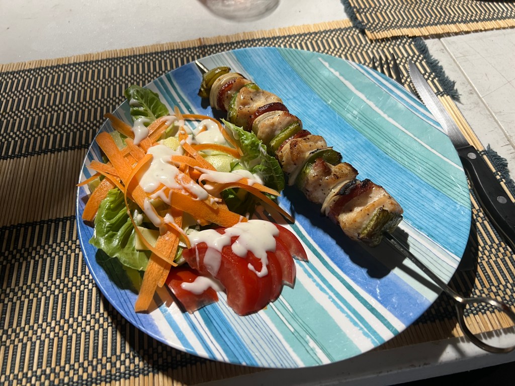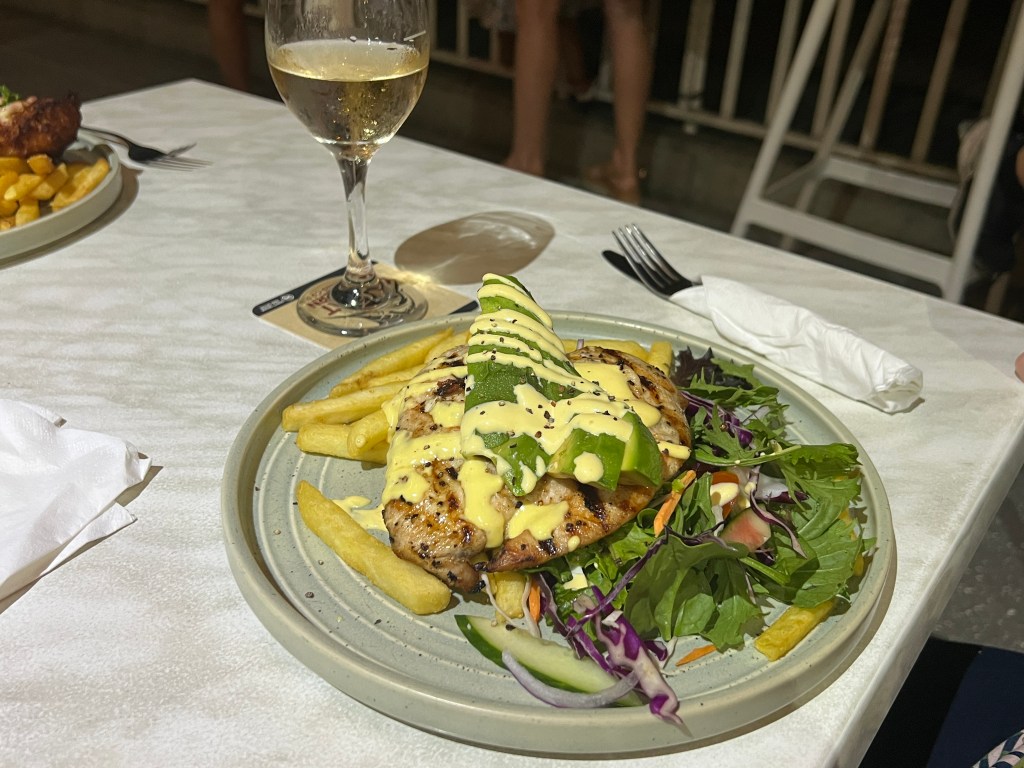 Nowhere for a quick late lunch though, so it was back on the road to Sarina. Pulled up there at an old milk bar type place that seemed to have every type of fast food one could want. Unfortunately, we settled for long hot chicken rolls and gravy, Homealone, had mayonnaise. Plus a serve of chips to share. No shortage of chips in these parts! Quite filling, left one with an oozie feeling in the belly which lasted all the way to Clairview and into the evening. An omelette was all that was necessary for dinner that night. Being eggs it was chicken again I suppose. The next night, chicken again! One of Allthego’s chicken and salami skewers, simple salad no chips.