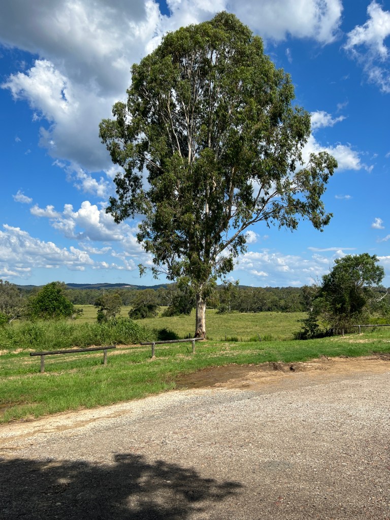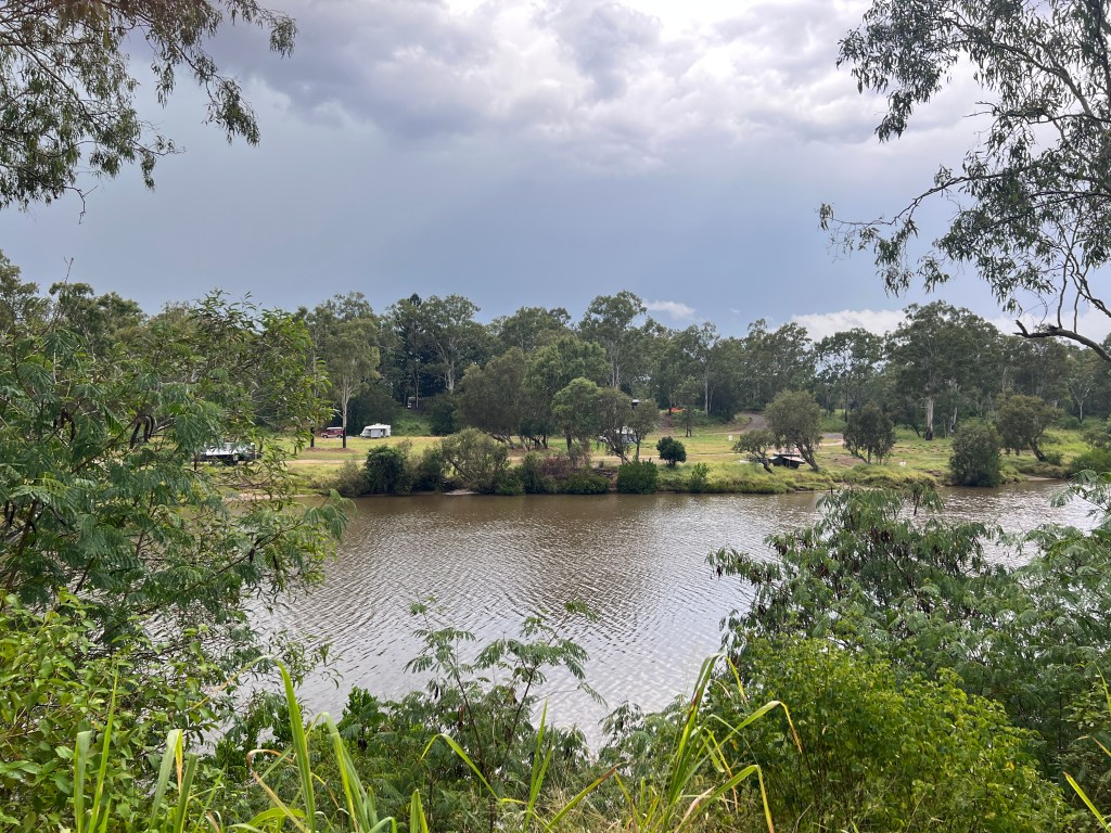 Time to move on and we are now sitting beside the Calliope River at a free camp, about 10 km north of the Gladstone turnoff. Got here and set up around 3 pm before a vigorous thunderstorm. Now a pleasant drizzle and degrees cooler, no humidity! Why did they call this place Calliope? I don’t know. She was the Greek muse in charge of eloquence and poetry, so very fitting for a blog post!