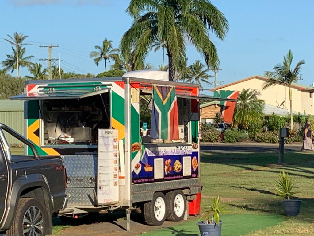 A developing trend for caravan parks is to get the local food trucks to set up shop in the grounds on selected evenings. Generally, the usual sort of fast food stuff. The park here though has tied up the local South African food truck, in national colours, with some quite tasty pre and post diner nibbles. Especially, the samosas.