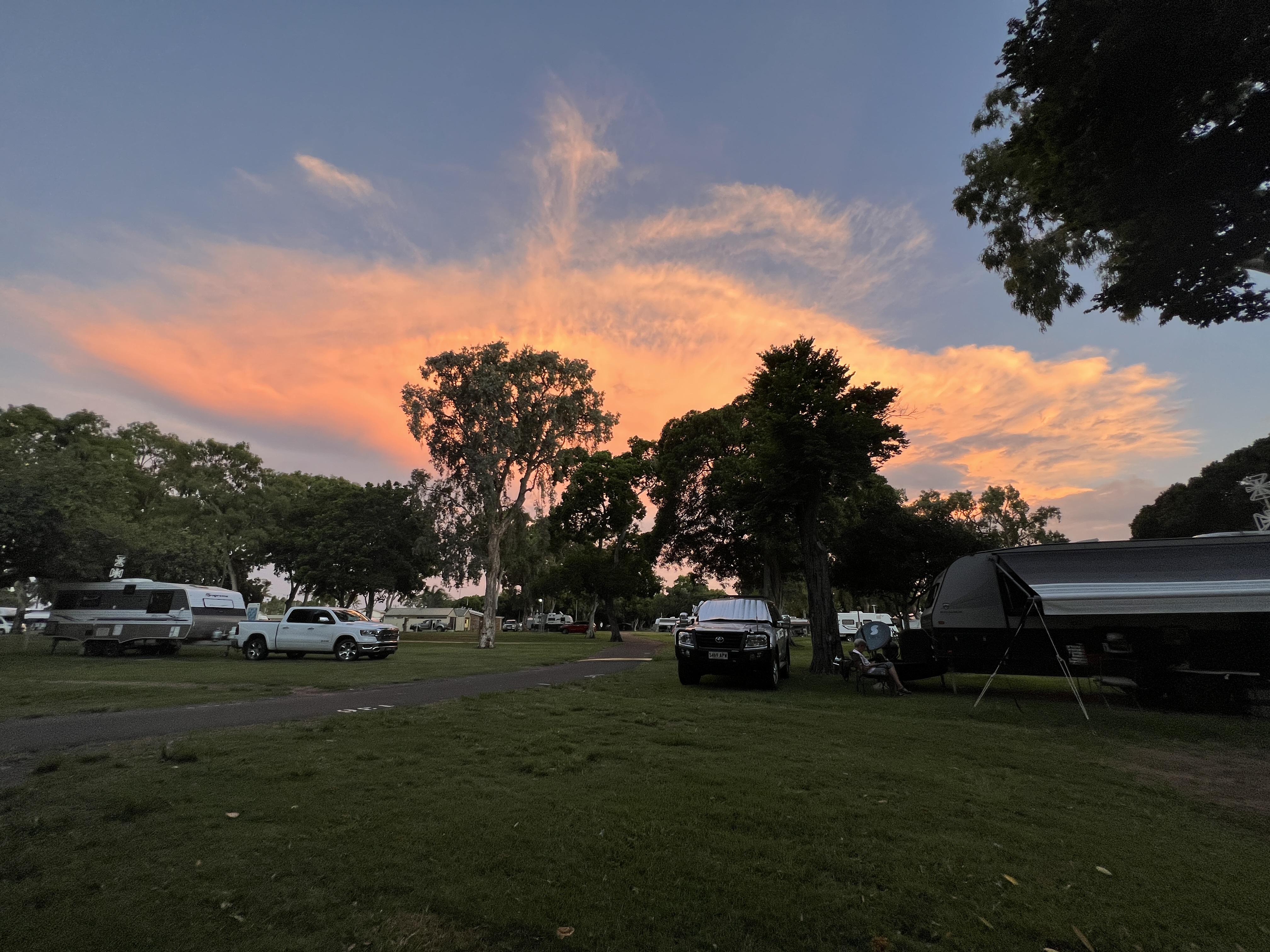 Made it down to Bargara, on the coast out from Bundaberg, from the free camp beside the Calliope River in good time, despite a bit of a braking problem with the truck. The Big 4 at Bargara is very spacious with nice shady trees, it’s their ‘Breeze’ brand…..doesn’t quite live up to the ritzier Big 4s that have rows of huts blocking the views of mere vanners, along with jumping castles, water parks and hoards of kids running amoke. So it suits us fine, nice red cloud sunset before settling in for the night.