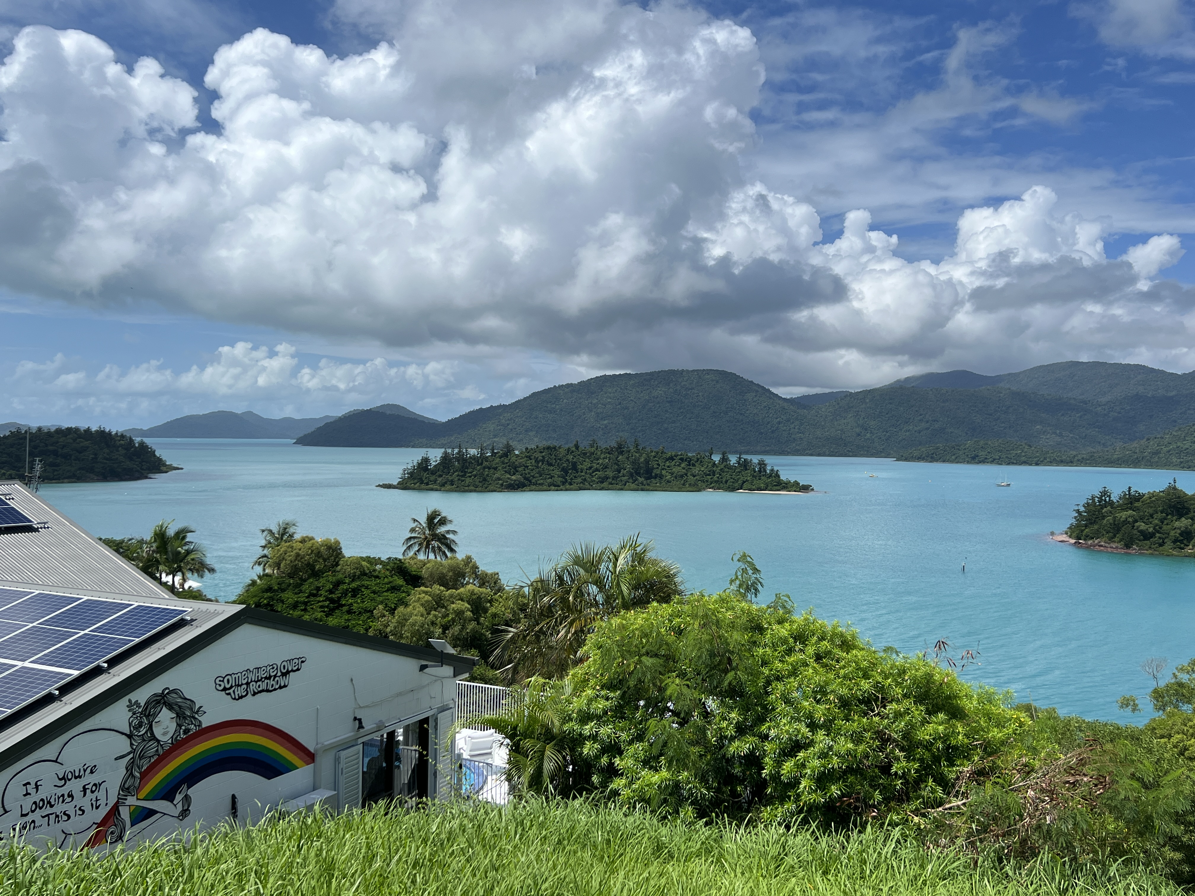 In Airlie we are staying four nights with the Funnells, old friends from Brisbane and Gold Coast days, now residing in the sunny tropics on the side of a steep hill overlooking the town and islands. Nice spot indeed. The van is off by itself in a storage yard at Cannonvale on the Airlie outskirts. Solar keeping the fridge running along ok.