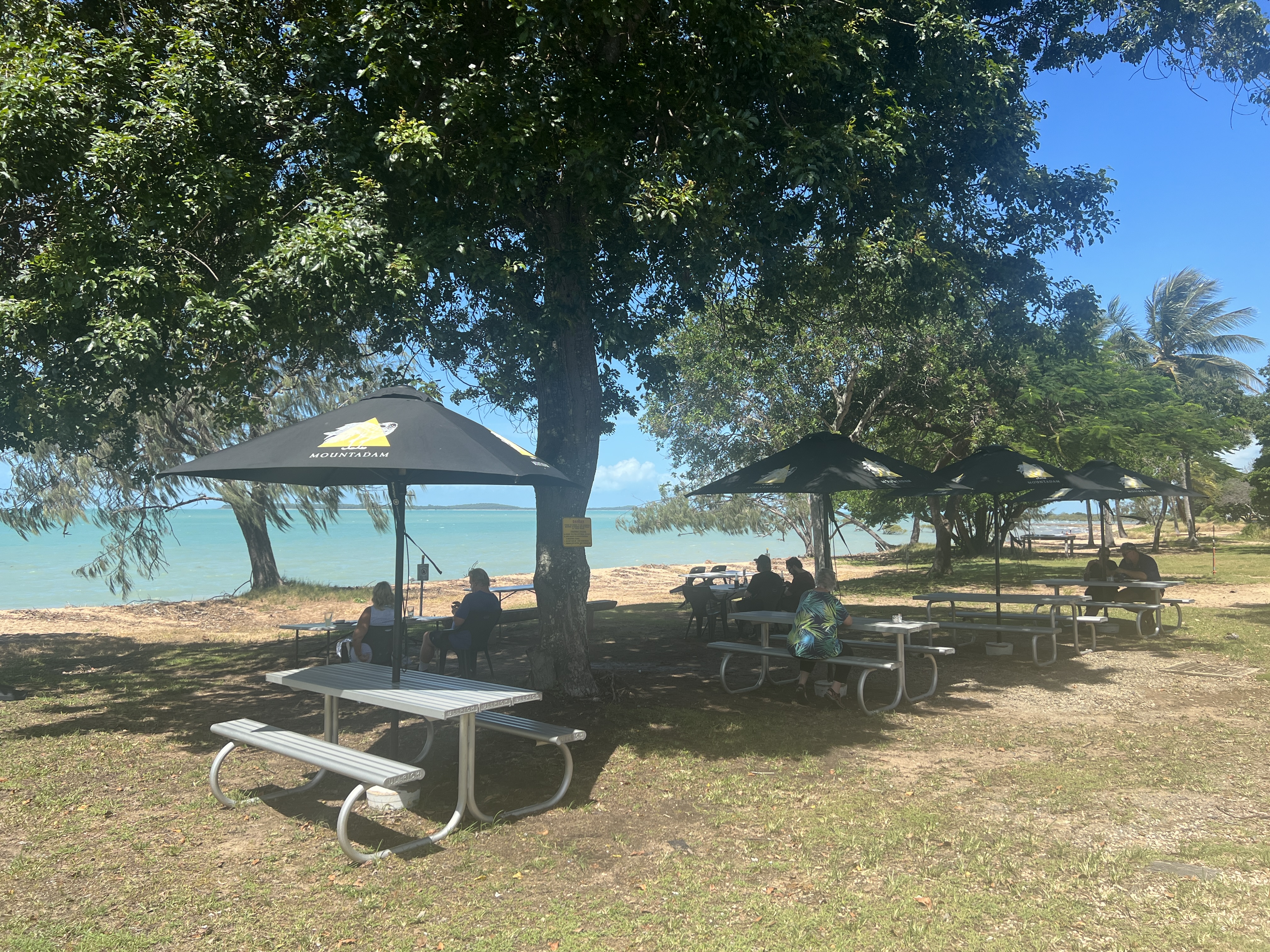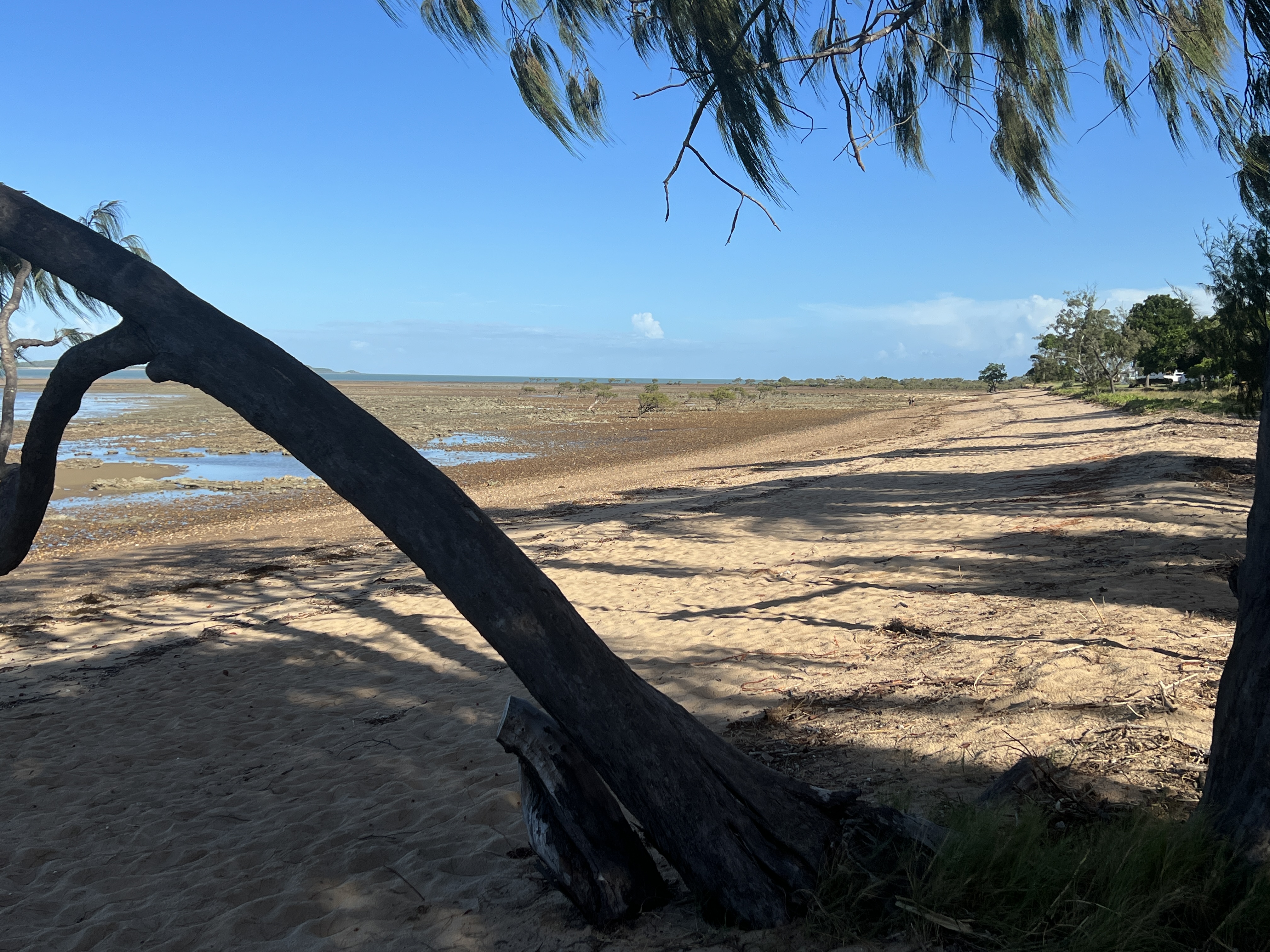 Have had three nights at Clairview, succumbing to the van’s air conditioning at night to get a good sleep. Rather hot and humid here beside the sea, even with the sea breeze. Not a lot to do either, besides sitting and looking out through the trees and coconut palms watching the tide come in and out across the sand banks and also warding off the midges as the sun sets.